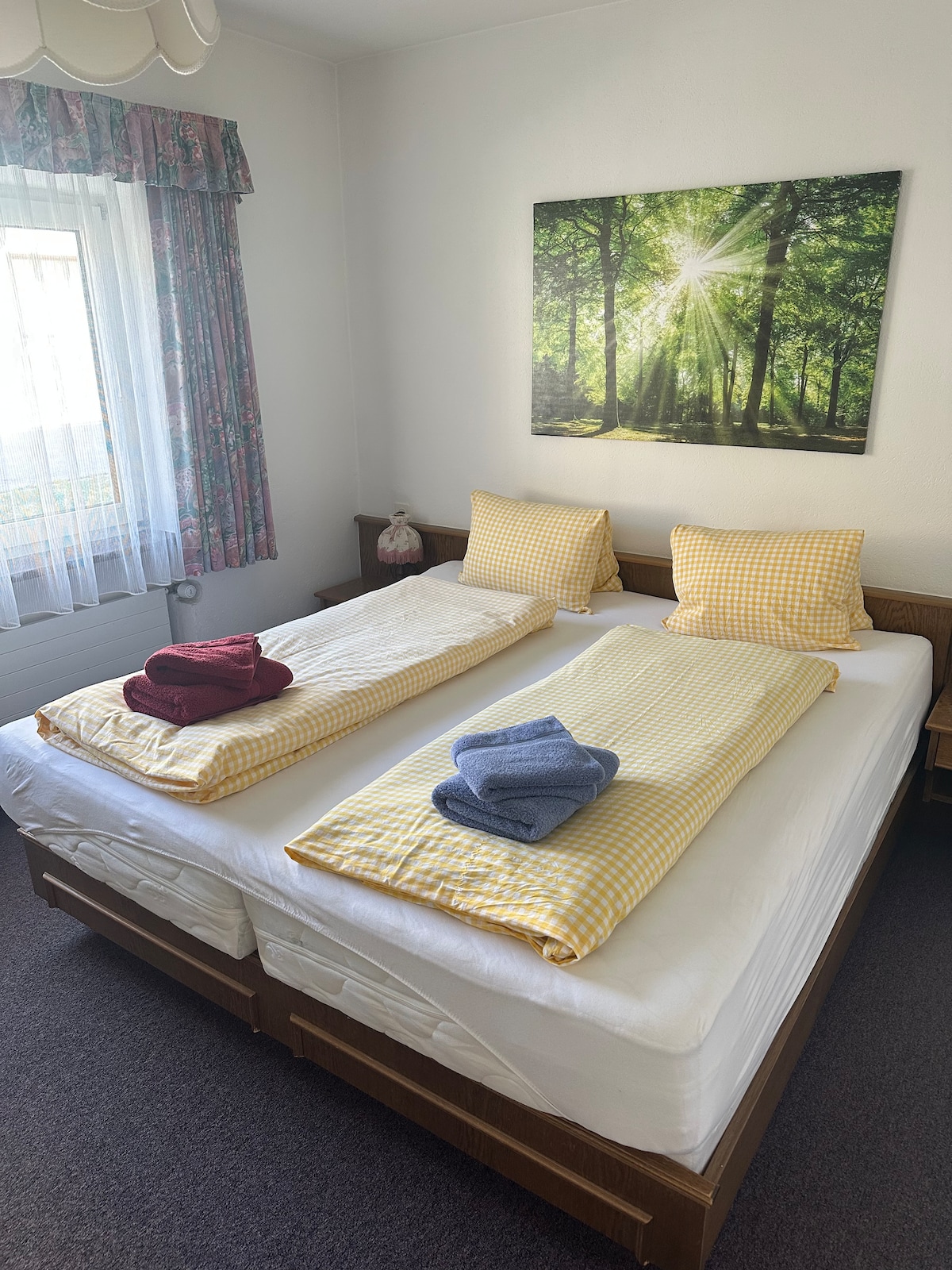 Camera doppia al primo piano con bagno/WC, bollitore e piccolo frigorifero. Niente balcone, niente vista sul lago. L'hotel si trova direttamente sul lago Forggensee, con una spiaggia privata, accesso diretto al lago e sauna.