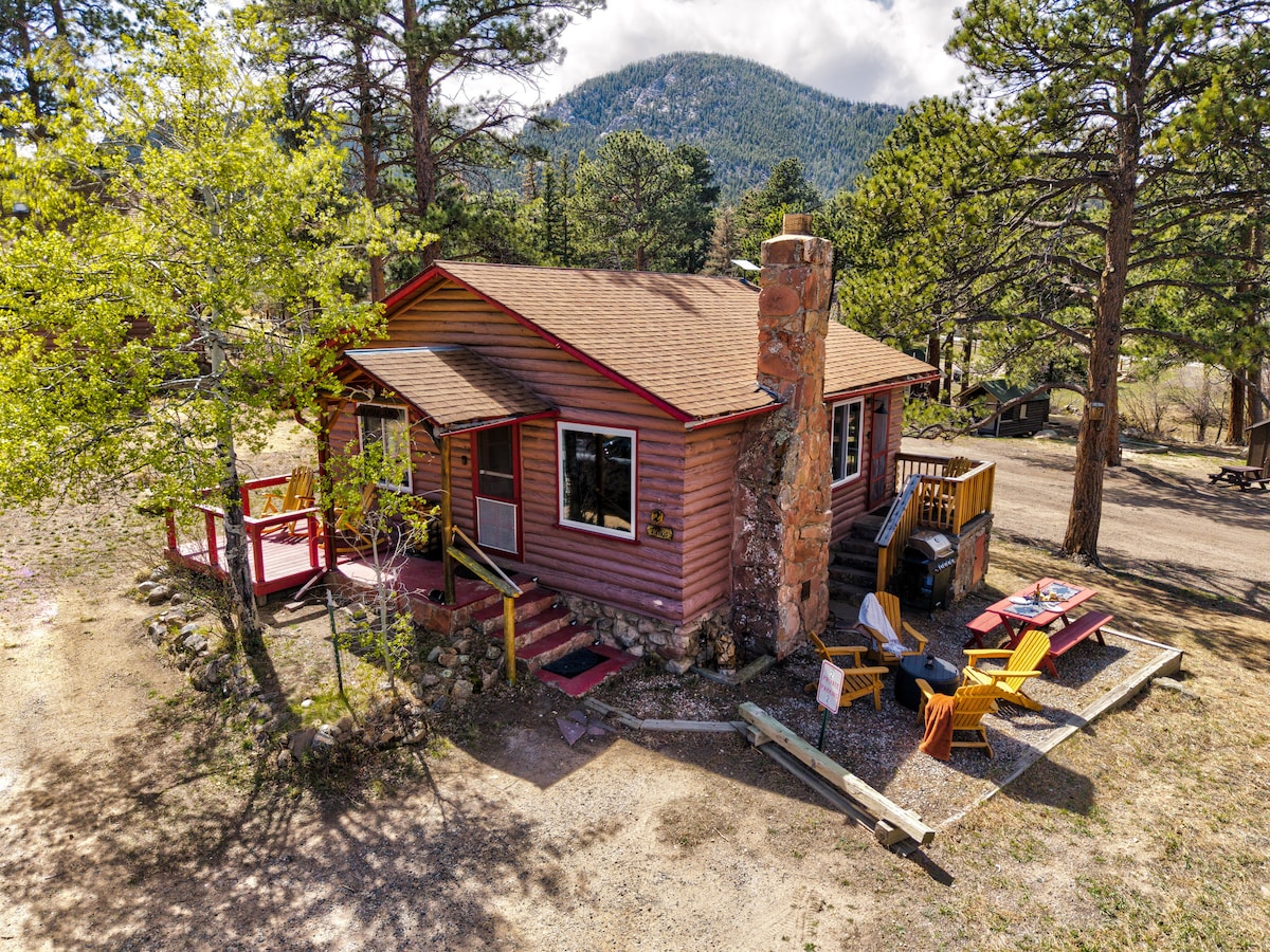 #20-NCD0303 Our historic, updated cabin is surrounded by amazing mountain views and open space, located half a mile from Rocky Mountain National Park entrance, where wildlife abounds. You'll love the fully equipped, modernized kitchen, adjacent dining table that seats six comfortably, new laundry appliances, and large living room with fireplace, leather couches, fur blankets, flat-screen TV & 1Gig WiFi. Perfect for families (with kids), couples, solo adventurers, and small groups of 4 or fewer.
