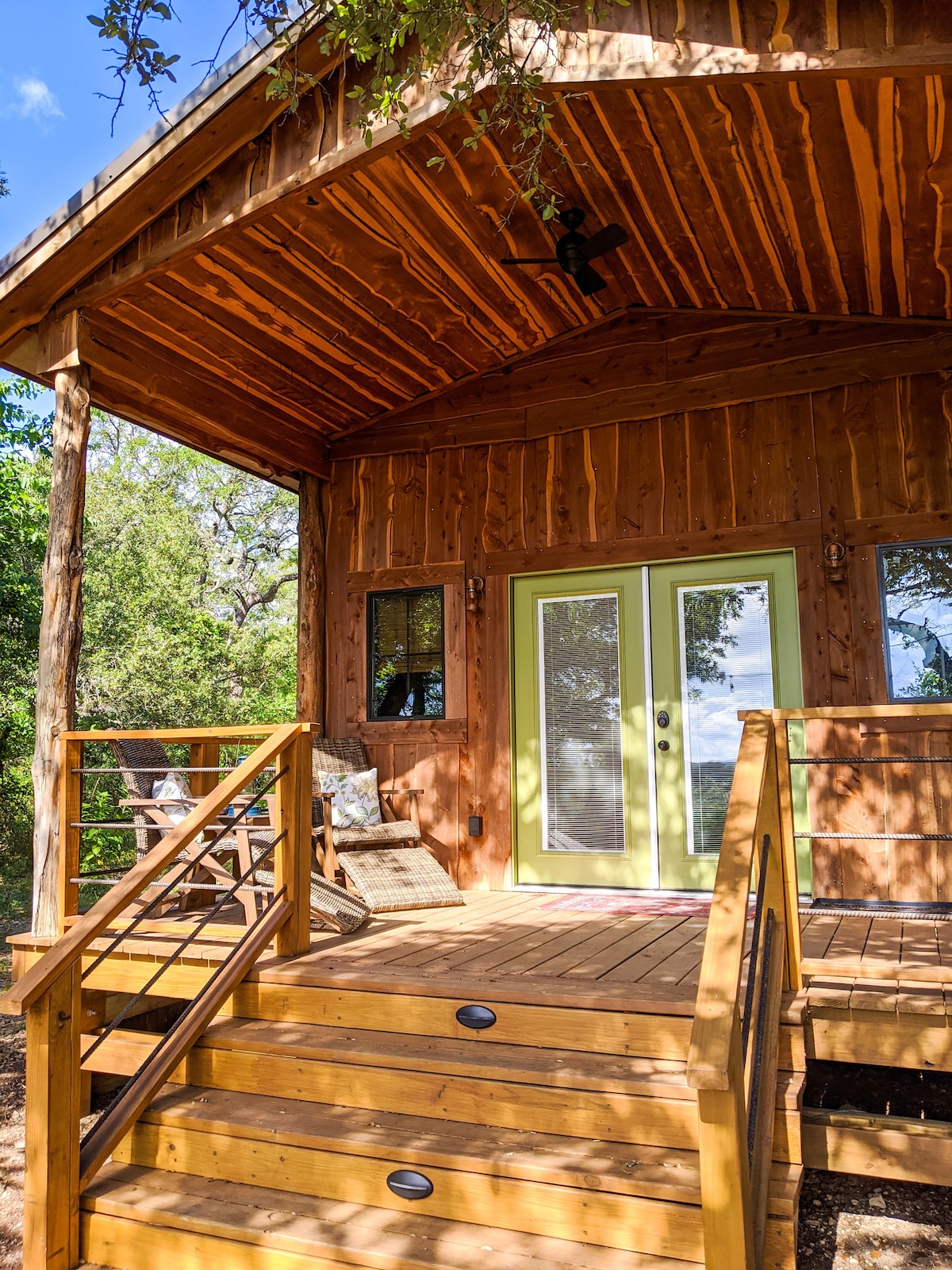 Il nostro chalet a 5 stelle è migliore che mai! Goditi giornate tranquille, tramonti spettacolari e notti stellate dal portico panoramico. Esplora le vicine cantine, i ristoranti, i negozi e i parchi statali per lo svago e la storia. La baita Sunset è costruita in cedro aromatico e pino. La cabina è arredata in modo confortevole e dispone di cucina completa, letto matrimoniale, zona giorno e wifi. Goditi la nostra acqua piovana pura e filtrata e la ricca fauna selvatica. Situato a un'ora da Austin o San Antonio.