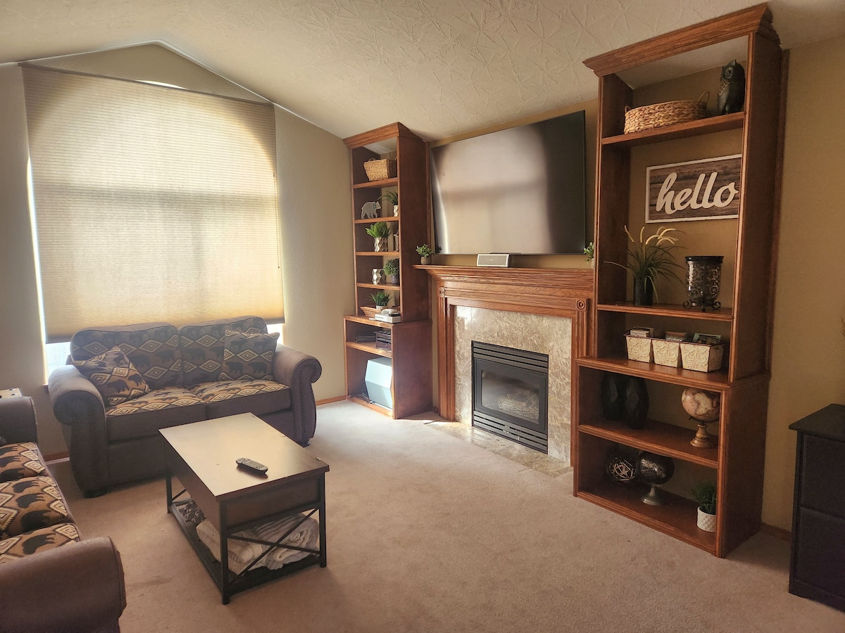 Pensione privata tutta per te in un quartiere fantastico. Una camera da letto al piano principale con cabina armadio, unità di riscaldamento/raffreddamento con telecomandi. Ampio bagno con doccia piastrellata. Lavatrice e asciugatrice impilabili nell'armadio del corridoio. La scala a chiocciola conduce alla zona loft con letti singoli, TV, console di gioco Wii e giocattoli. Situato in un tranquillo quartiere pedonale con posto auto privato. Ristoranti, negozi, stazioni degli autobus e di servizio, accesso rapido all'autostrada e campi da golf, tutti nel raggio di 2,4 chilometri.