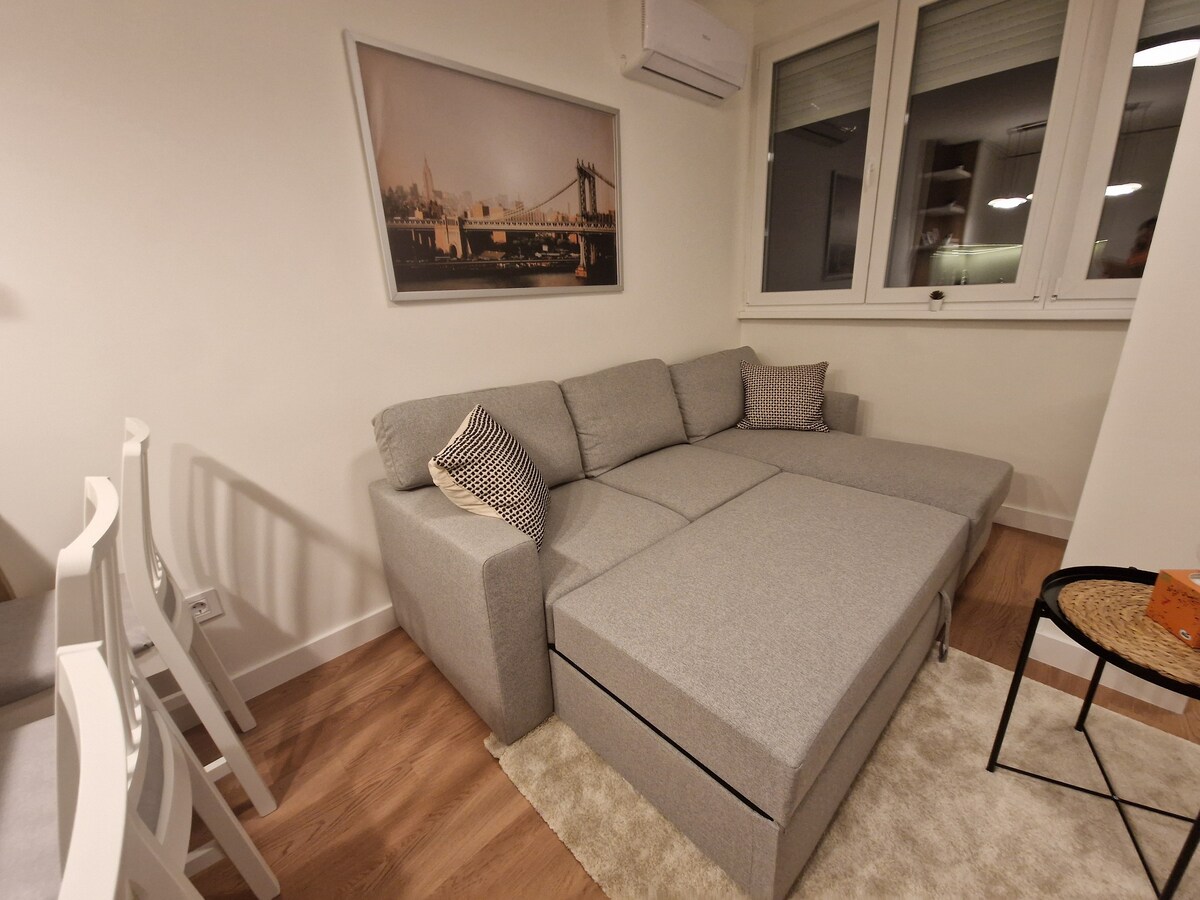Lussuoso appartamento contemporaneo, progettato secondo specifiche elevate, con posto auto extra large nel parcheggio sotterraneo. L'ente regolatore ha assegnato agli appartamenti privati la categoria 4* più alta. Completamente legale e conforme a tutti i requisiti governativi per gli affitti a breve termine. Si trova nel quartiere esclusivo di Belville, vicino al centro commerciale Delta City, al fiume Sava e alla spiaggia di Ada. Il centro città dista solo 6 km ed è facilmente raggiungibile con numerosi mezzi pubblici o taxi.