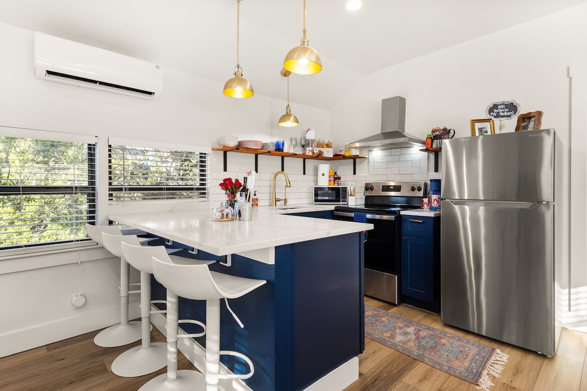 Boutique barn stay on 9 peaceful acres • Just 7 min from downtown Boerne • King suite + cozy living area w/ sofa sleeper • Full kitchen for easy meals • Outdoor games & wide open space • Wildlife under beautiful oak trees • Feed the deer with deer corn provided • Texas-themed charm with luxury touches • Brand-new mural wall by renowned artists—perfect photo spot • Relax under starry skies & explore Boerne’s Hill Country magic NO SMOKING OR VAPING (tobacco or marijuana)