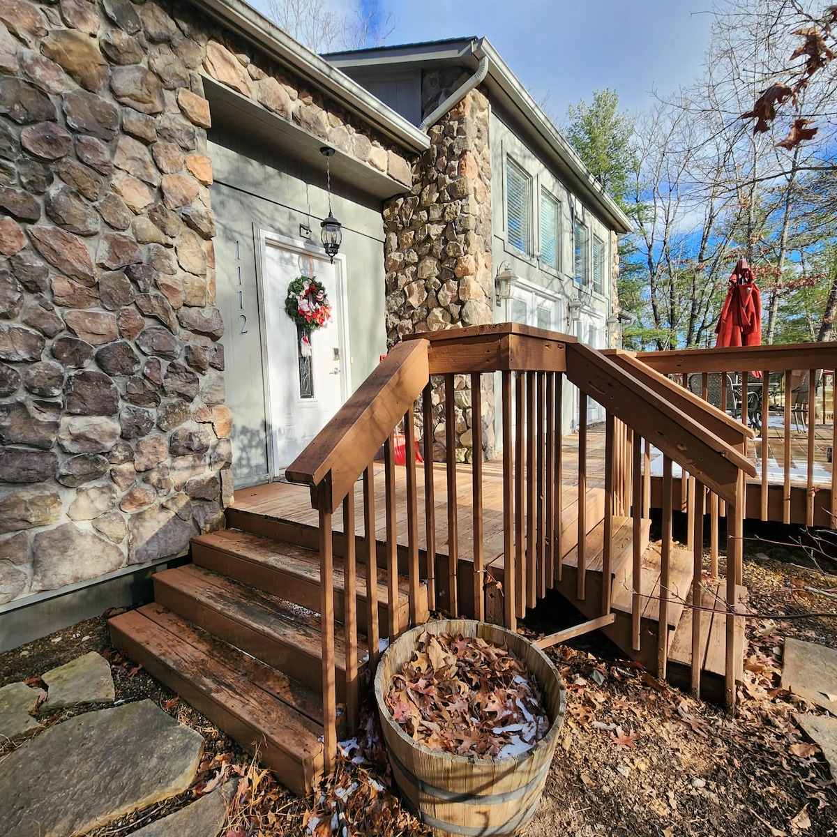 Nestled in the Shenandoah mountains, perched over a glimmering pond, step through 2 hand-carved doors to find yourself warmly welcomed into our spacious 5 bedroom, 5 bathroom home. ✓ Conversation pit and floating fireplace with cathedral ceilings ✓ Full kitchen, stocked and ready ✓ A bathroom for each bedroom ✓ 6 comfortable beds ✓ 3 game rooms (air hockey, darts, foosball, and pool) ✓ 6 covered decks ✓ 50” TV with Roku ✓ Full-sized washer/dryer ✓ Fast Internet to work from home