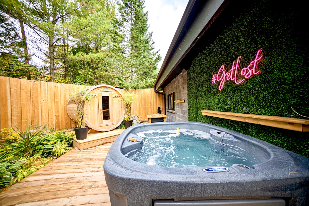 LEGGERE! Monte St. Louis e Horseshoe Valley a portata di mano! Si tratta di una SUITE PER GLI OSPITI luminosa, grande e privata (appartamento seminterrato). Vasca idromassaggio, patio, focolare e sentiero appartato nel bosco per godersi la natura. La cucina è dotata di piano cottura a induzione e di tutto il necessario, persino di un apribottiglie per il vino :) Soggiorno/cucina/sala da pranzo open space con TV e Roku. La camera da letto è un capolavoro: scura, misteriosa e romantica! Letto matrimoniale personalizzato realizzato in legno di fienile stagionato recuperato dalla nostra proprietà.