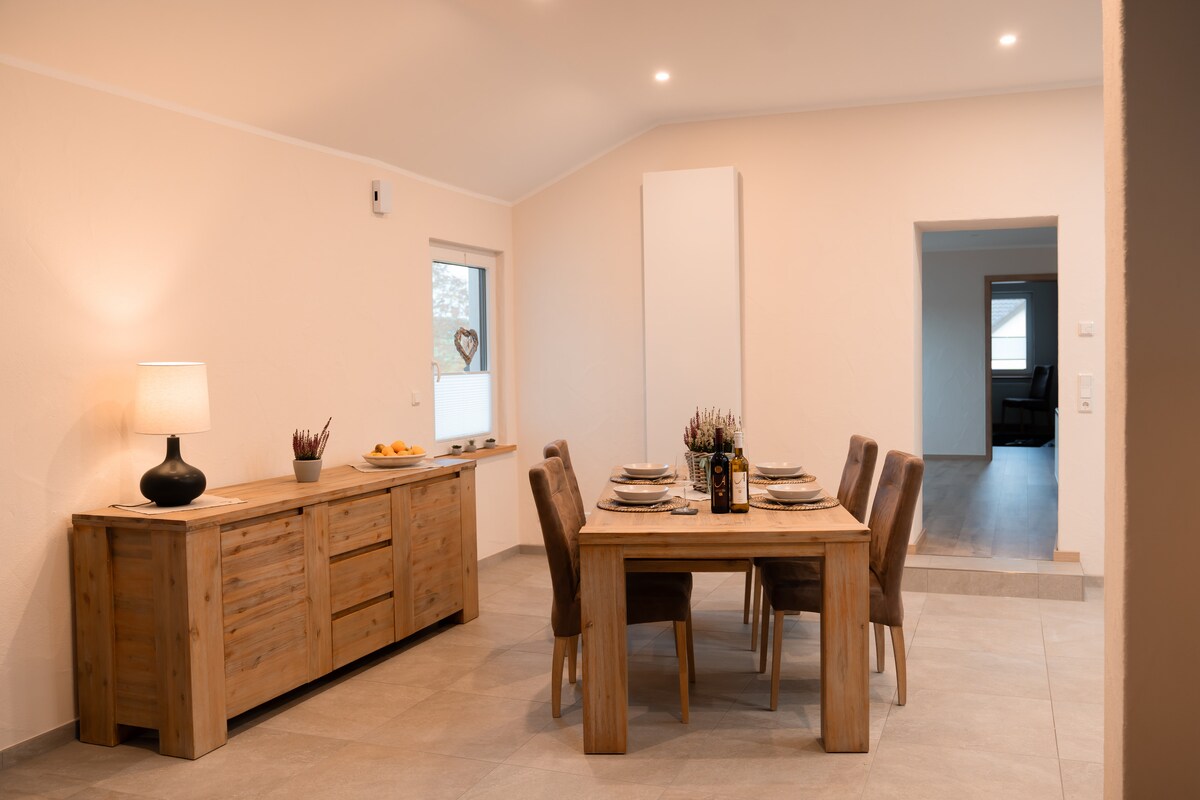 Willkommen in unserem traumhaften Ferienhaus. Unser wunderbar ruhig und doch zentral gelegenes Ferienhaus bietet Ihnen ein tolles Grundstück mit wunderschönem Ausblick. Das traumhaft Wohnzimmer mit offener Küche und allem was man braucht, wird Sie begeistern. Gemütliche Möbel laden hier zum Entspannen und gemütlichen Verweilen ein. Ein Highlight im überdachten Außenbereich ist unser Whirlpool, der bei jeder Witterung zu ihrer Verfügung steht. Unsere Sauna rundet das Wellness-Angebot ab.