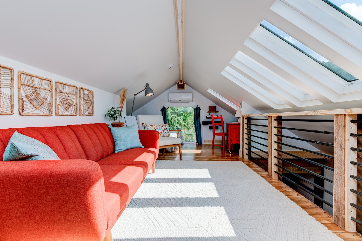 This rustic three-story cabin and Barn is ideal for larger groups and gatherings. It’s a wonderful space for retreats, yoga and meditation groups, workshops, and more. Nestled on over three wooded acres in the beautiful Fairview, the property offers a peaceful setting while remaining close to Asheville. The home is both spacious and cozy, designed with many healing elements throughout, including salt lamps, diffusers, and a curated healing library to support rest, reflection, and relaxation.