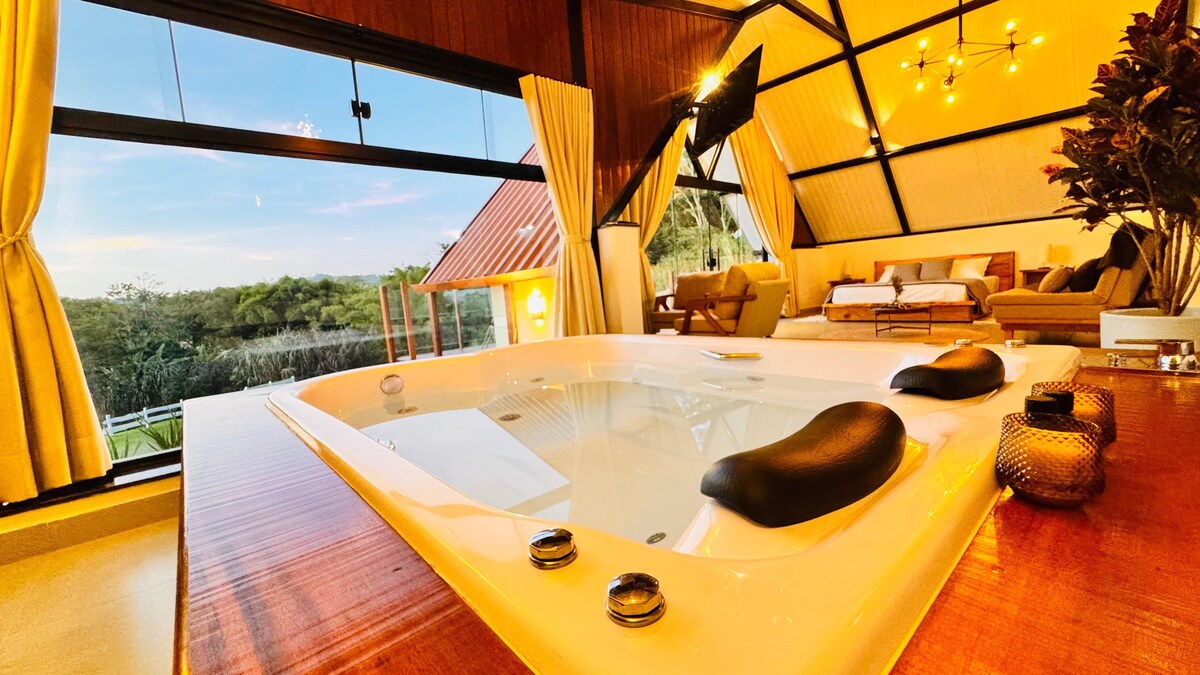 Cabana cheia de estilo criada para proporcionar a casais, momentos especiais que reforcem seus relacionamentos e criem momentos incríveis para ficar guardado na memória para sempre. Localizada em meio a Natureza, com uma vista para um pôr do sol de tirar o fôlego. Temos café da manhã, personal chef e massagens com custo adicional. Próximo ao centro, mercados e restaurantes. Entregam ifood 🥰 Somente 45 minutos de SP