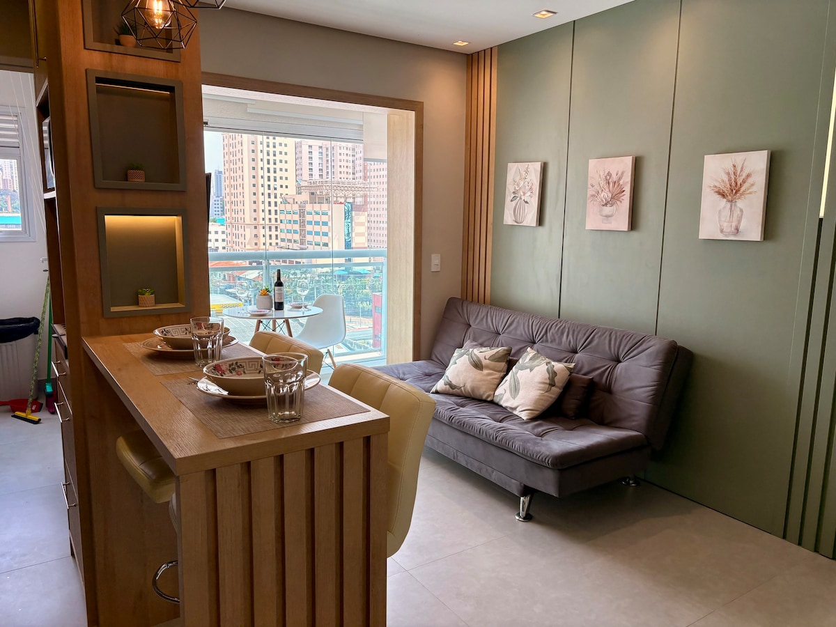 Numa região super central , essa cobertura duplex promete tirar seu fôlego. De frente para a praça Rotary e com o skyline da cidade ao fundo, cada janela enquadra um cartão postal. Andar de baixo uma sala com cozinha integrada e cheio de plantas da flora brasileira. O andar de cima, uma suíte com closet e terraço privativo recheado de plantas frutíferas e chuveirão com água aquecida.