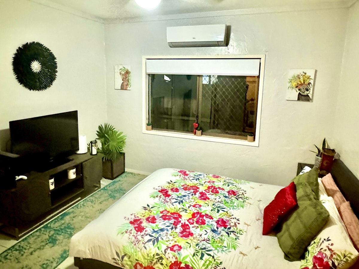 15 mins drive from town. Gorgeous Rainforest Haven! Private Entrance,Self Contained,Kitchen,lge bedroom+ensuite,courtyard, table chairs, Aircon. Sink Microwave cutlery crockery cooking utensils,tea coffee milk, toaster, portable cooktop, Air-fryer, BBQ. TV+Netflix. Attached to thick front wall of house that also has an unused locked door as part of wall . Still Very private. Lil & Rob live here +Ziggi our small non-malting clean humanoid pooch! Share laundry pool yard. Tapwater great4drinking