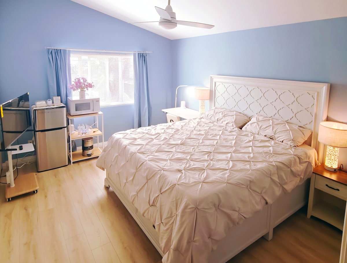 Suite con ingresso privato. Due letti king-size. Adatta a un massimo di 4 persone. Avrai un grande spazio solo per te. Dormirai su morbide lenzuola in cotone su due letti king-size con materasso in memory foam. Hai la tua unità AC, TV con Amazon Prime e molti film gratuiti. Hai a disposizione un angolo cottura con elettrodomestici di base e un frigorifero di grandi dimensioni. Goditi il bagno padronale con doccia, vasca, doppio lavandino e asciugamani morbidissimi, nonché sapone e shampoo con balsamo in formato da hotel.