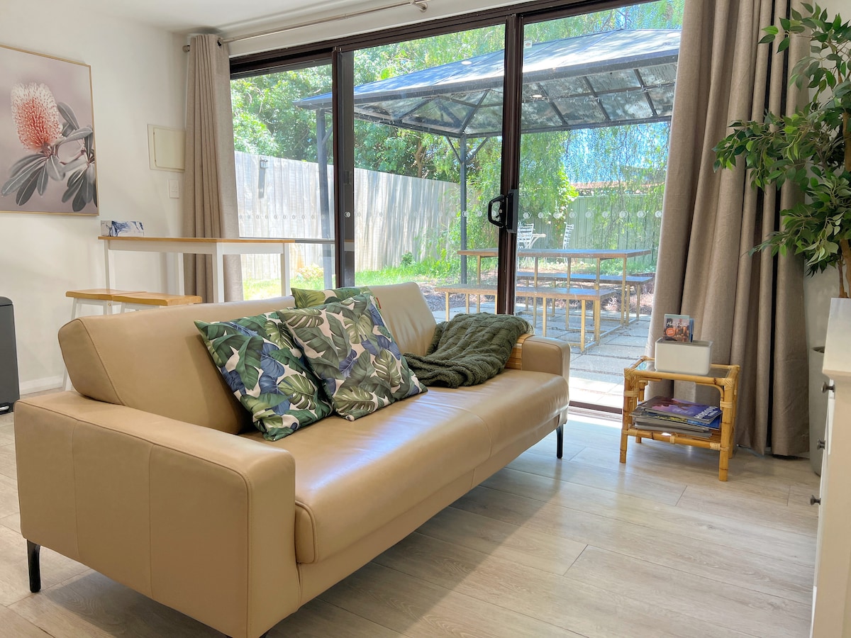 WEEKLY & MONTHLY DISCOUNTS. Designed for comfort & easy living. Luxury coastal retreat, ideal for working from home, retirees, couples, families & sports fans seeking a longer stay. VIEWS Enjoy ocean views, gentle beach walks & generous space across two levels. DOWNSTAIRS, SLEEPING two bedrooms & living room with sofa bed. Garden views, bathroom & laundry. UPSTAIRS, offers leather SEATING in stunning lounge, modern kitchen, dining for 6, HUGE office, powder room & sunny balcony with BBQ.