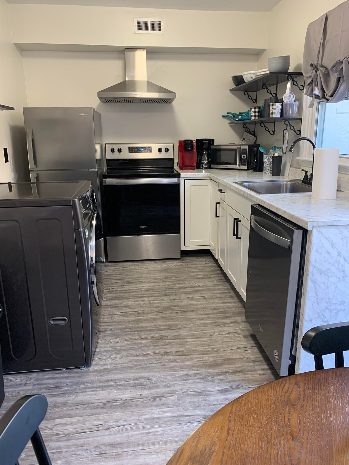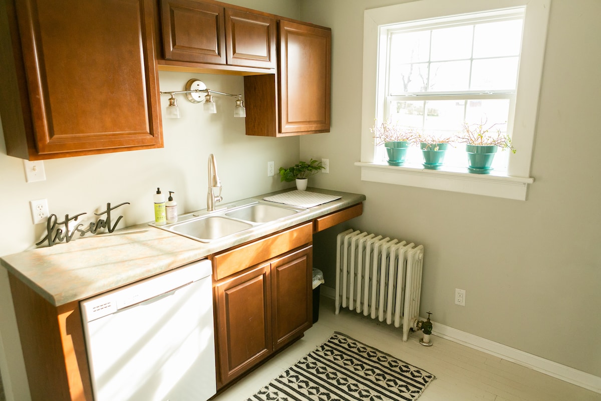 Cortile privato bello e spazioso con dondolo, altalena sull'albero e illuminazione esterna. Include angolo cottura con frigorifero/congelatore, macchina per caffè Keurig, forno a microonde, tostapane, piccolo forno a convezione (abbastanza grande da cuocere una pizza surgelata), nonché una piccola scorta di snack/prodotti per la colazione. Splendido bagno piastrellato con vasca con piedini. Divano e divanetto per rilassarsi. Hulu e Netflix inclusi, così come giochi da tavolo e di carte. Include una scrivania per studiare/lavorare.