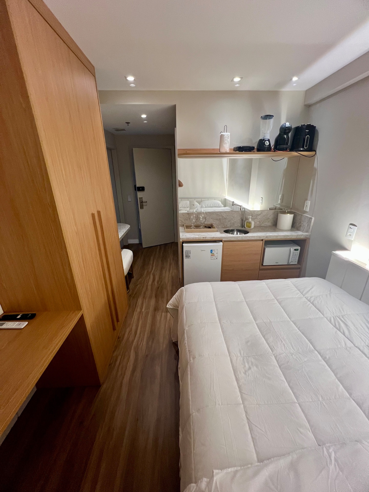 Flat muito aconchegante e bem localizado! O mesmo possui mobília de primeira linha, duas camas de solteiro, guarda-roupa, pia, banheiro, louça completa, jogo de toalhas e roupas de cama, contendo edredons e travesseiros, ar condicionado, sofá, mesa de trabalho, televisão, wi-fi, vaga de garagem, geladeira duplex e fogão, além de ter secador de cabelos e serviço de limpeza. Andar alto e ótima vista da cidade. Excelente para quem está a trabalho ou a turismo, devido a sua boa localização!