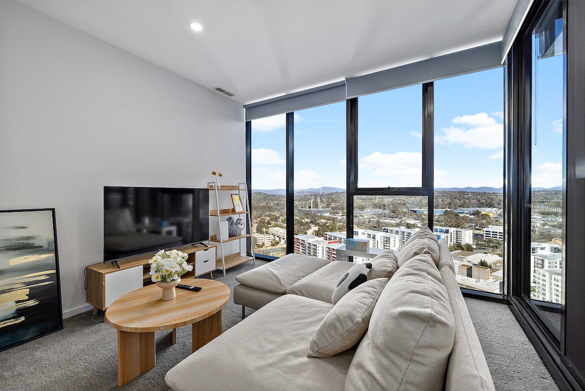 Situated high in Canberra’s tallest building, this apartment offers breathtaking lake views, 2 private bedrooms and 2 parking spaces. The master bedroom features panoramic lake views, while the second has balcony access. From the balcony, take in mountain vistas, stunning sunsets, and a serene garden pool view. 23rd-floor Sky Garden with BBQ. 5th-floor: Pool, Sauna & GYM. Steps from lakeside dining & Park. Direct buses to City, ANU, GIO Stadium & AIS. Easy access to UC & Westfield.