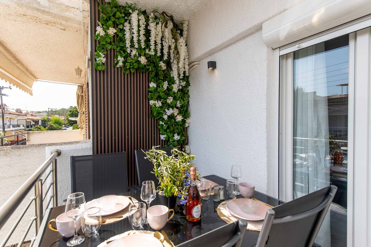 A luxurious 1st floor apartment in Nea Poteidaia, 30 meters from the seashore, with an unhindered sea view. The 2 person hammock at the balcony is an amazing experience for those who want to relax over the sea!Enjoy your favorite series and movies on a 50-inch wide smart TV. Relax on the huge corner sofa or balcony chairs while admiring the incredible view!Just near the center of the village, only a bunch of meters away from the sea waves!You can actually hear the sea at night!