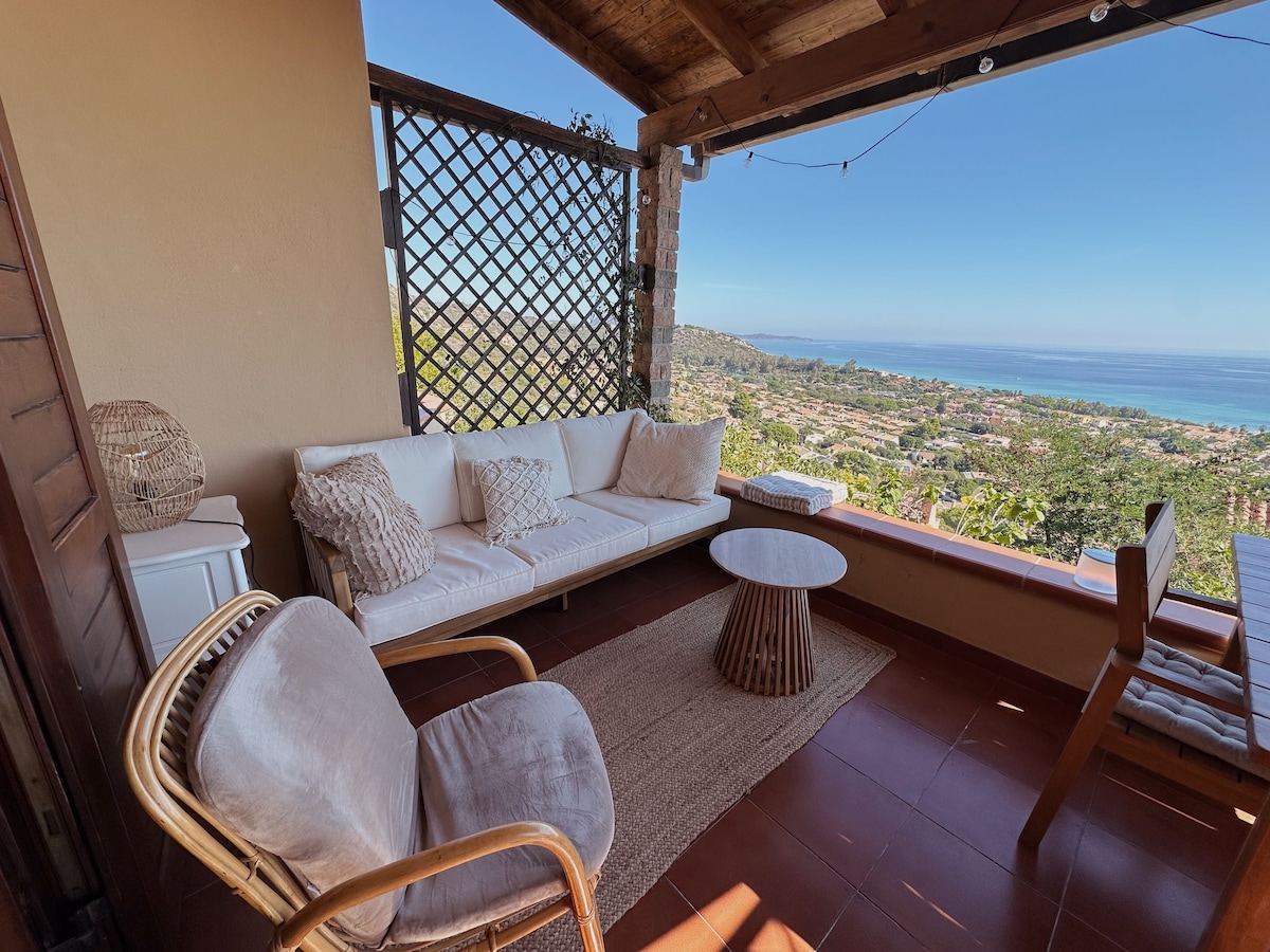 Appartamento con terrazza privata e vista panoramica sulle colline circostanti e sul mare. L'appartamento è dotato di zona living con angolo cottura, una camera da letto con letto matrimoniale, due divani e un bagno privato. Il B&B è situato in cima ad una collina, lontano dal rumore del traffico e delle città. Perfetto per stare in relax e godersi una rilassante vacanza. La colazione, compresa nel prezzo, viene servita ogni mattina nella veranda porticata.