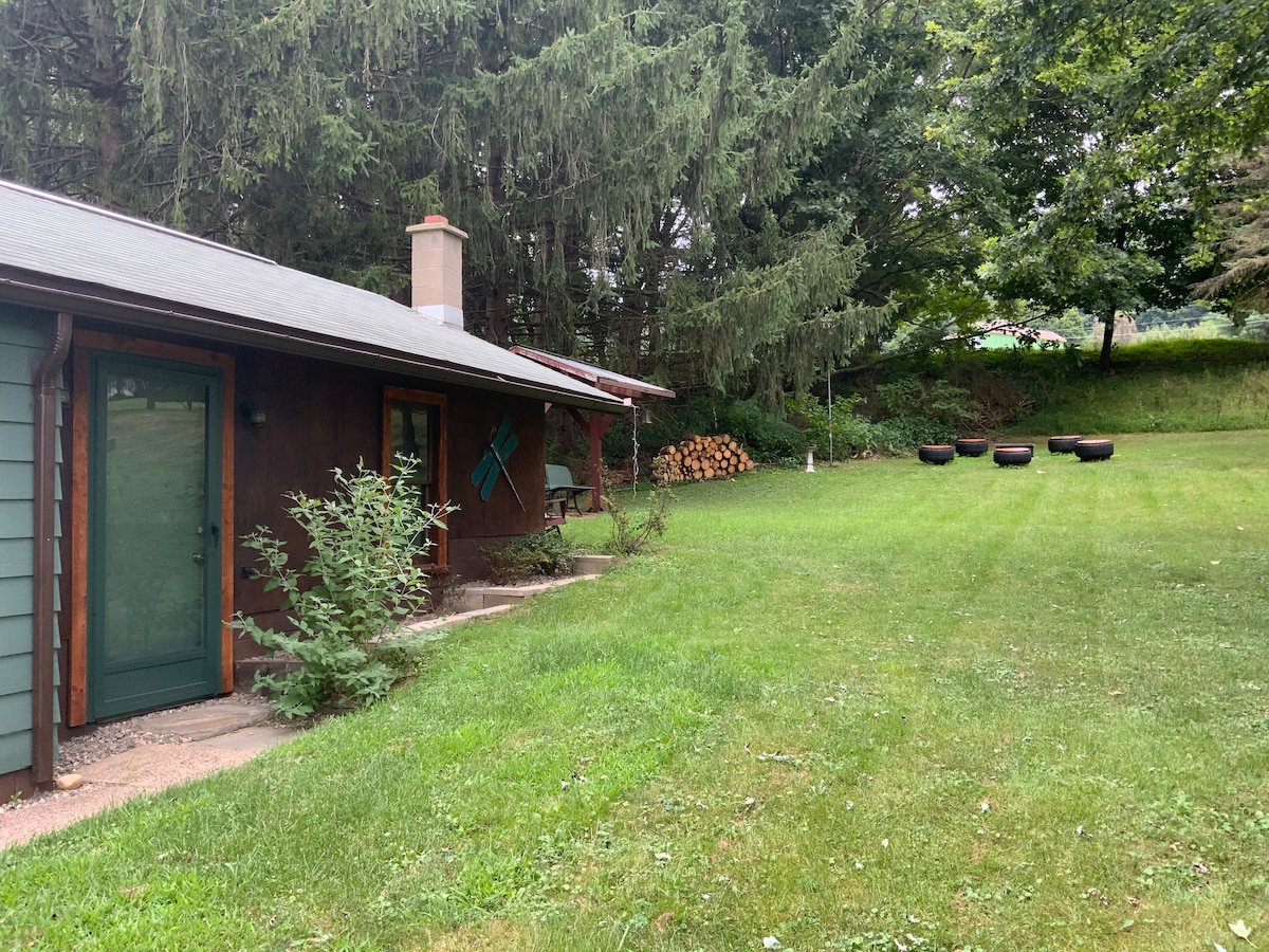 Ambiente tranquillo e boscoso per un'autentica baita in legno: *Area boschiva autonoma. I proprietari vivono nelle vicinanze. Altre case visibili d'inverno. *1/2 miglio di strada sterrata di campagna passa davanti alle case sulla strada per il cottage. Si prega di guidare lentamente! *Segnali lungo la strada dopo che il GPS si spegne. *Area di parcheggio per inversione. * Bagno completo *Cucina: forno a convezione/ friggitrice ad aria/forno a microonde, Keurig, tostapane, frigo/ piccolo congelatore. *Letto matrimoniale a soppalco *Double Futon *Pentole, padelle, utensili *Servizio al tavolo per 4 *Giochi, libri