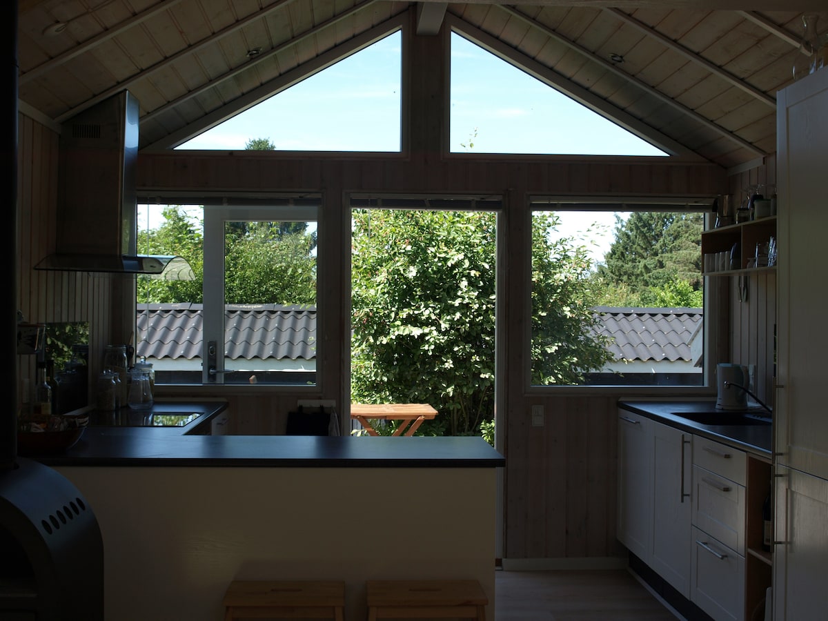 La nostra dependance è composta da una camera con un angolo cottura e un bagno con doccia. C'è un letto matrimoniale, una zona pranzo e una cucina con frigorifero, un bollitore elettrico, un tostapane e un forno combinato. (Niente piastra) C'è caffè/tè gratuiti. C'è una porta del patio che conduce alla terrazza privata in piastrelle, con mobili da giardino e griglia a gas. È possibile avere una macchina/biciclette parcheggiata nel parcheggio. SuperBrugsen è pari a 100 metri e netto a 400 metri. C'è un cinema a circa 50 metri da qui e diversi ristoranti nelle vicinanze. La dependance si trova in uno spazio verde.