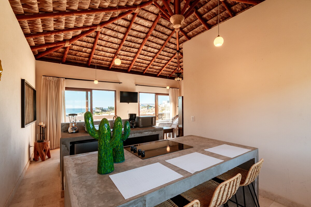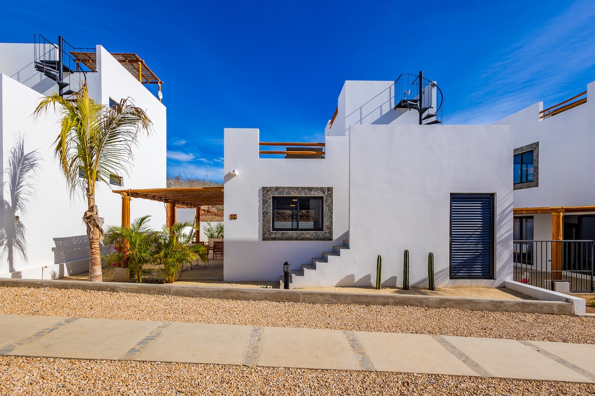 Viste mozzafiato da ogni direzione! Lasciati stupire dalla bellezza della Bassa California del Sud da questo appartamento nuovo di zecca, elegante e completamente attrezzato. Goditi un caffè sulla terrazza mentre ammiri l'alba sulle montagne. Dopo una giornata di surf e nuoto sulla spiaggia di Cerritos (a pochi minuti a piedi o in auto), rilassati nella vasca idromassaggio mentre il sole tramonta sul Pacifico. Con una vista senza ostacoli da ogni angolazione, ti garantiamo che potrai vedere le balene durante la stagione. Più privacy rispetto agli appartamenti