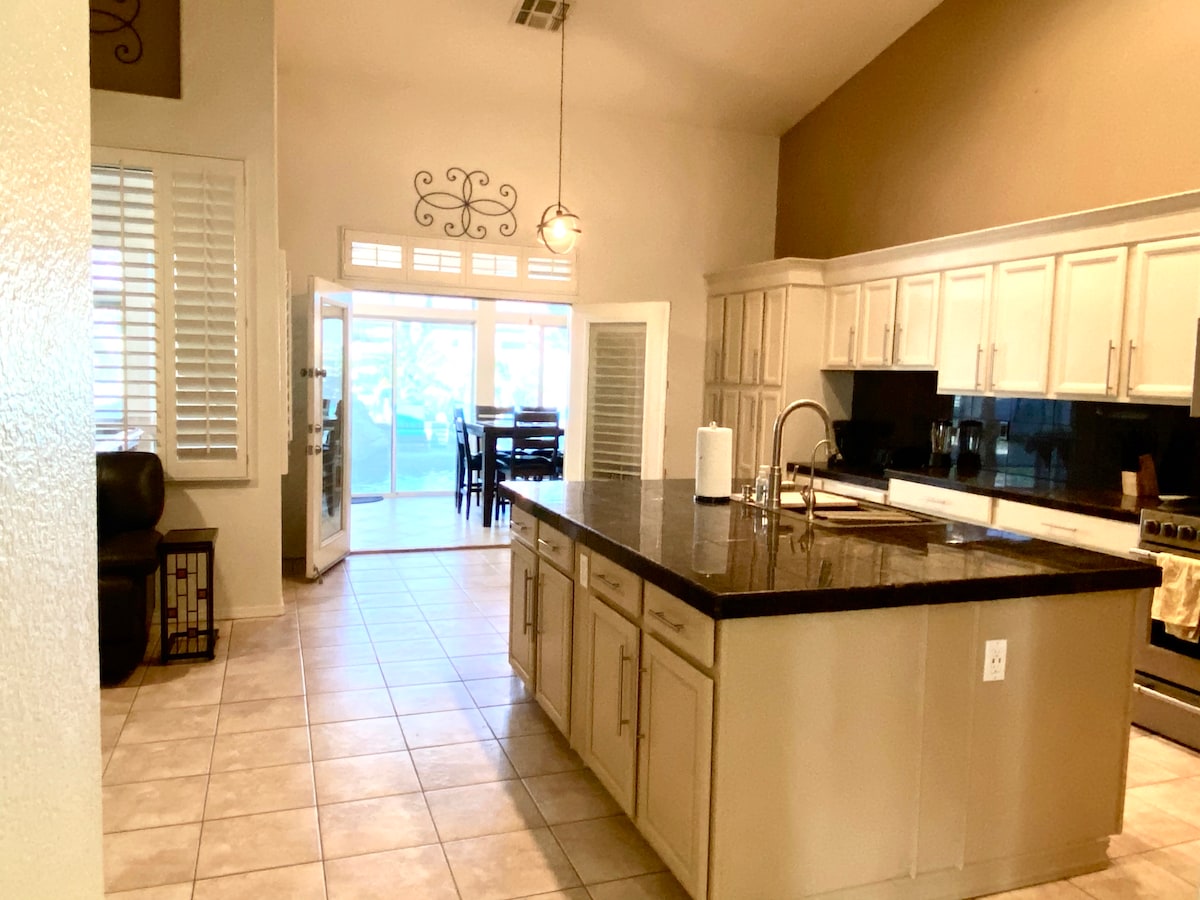 Benvenuti nella mia casa! La mia casa si trova in una tranquilla comunità a N. Chandler, in Arizona. Non sono ammessi animali domestici. L'alloggio è spazioso con 3 camere da letto (1 BR è un ufficio), 2 bagni e soffitti a volta. Ho un bellissimo acquario salato. Il cortile sul retro ha un grande patio, un braciere, una fontana, un caminetto elettrico, fiori e molto privato. C'è una piscina (non riscaldata), una vasca idromassaggio, un campo da tennis, una pallina da sottaceto e un campo da basket. Pkg è in 2 garage per auto, vialetto o strada, 3 auto max. Alcuni dei miei effetti personali sono in casa.