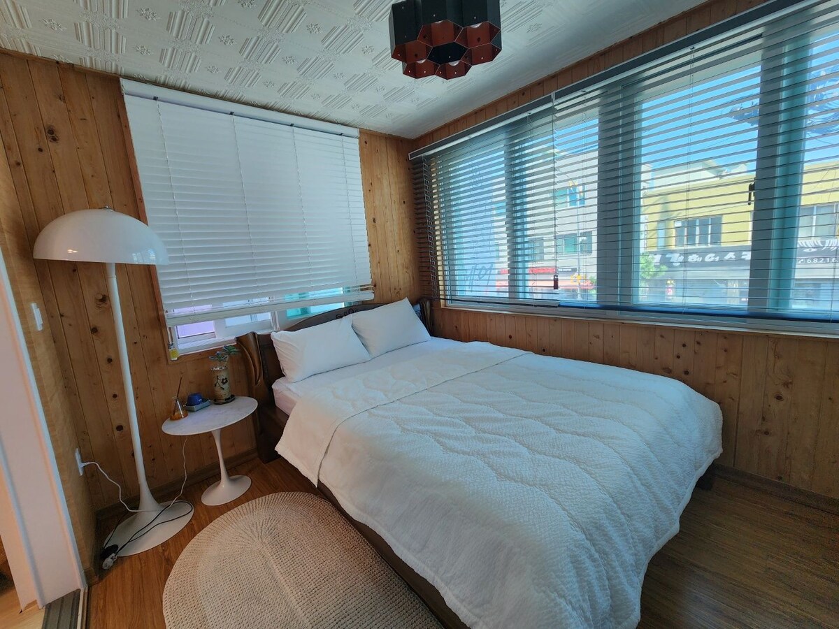 È uno spazio ampio adatto per più persone e con un buon accesso al mare, ristoranti, minimarket, supermercati, ecc. Spiaggia di Chodo, spiaggia di Hwajinpo e il percorso Dulle-gil del lago Hwajinpo sono tutti raggiungibili a piedi. Comprende 2 camere grandi, un ampio soggiorno, una grande cucina e 1 bagno. È possibile visitare il Parco Marino di Daegok, la villa di Kim Il-sung, la villa di Lee Seung-man e il Museo Ecologico utilizzando il noleggio gratuito di biciclette di Hwajinpo.