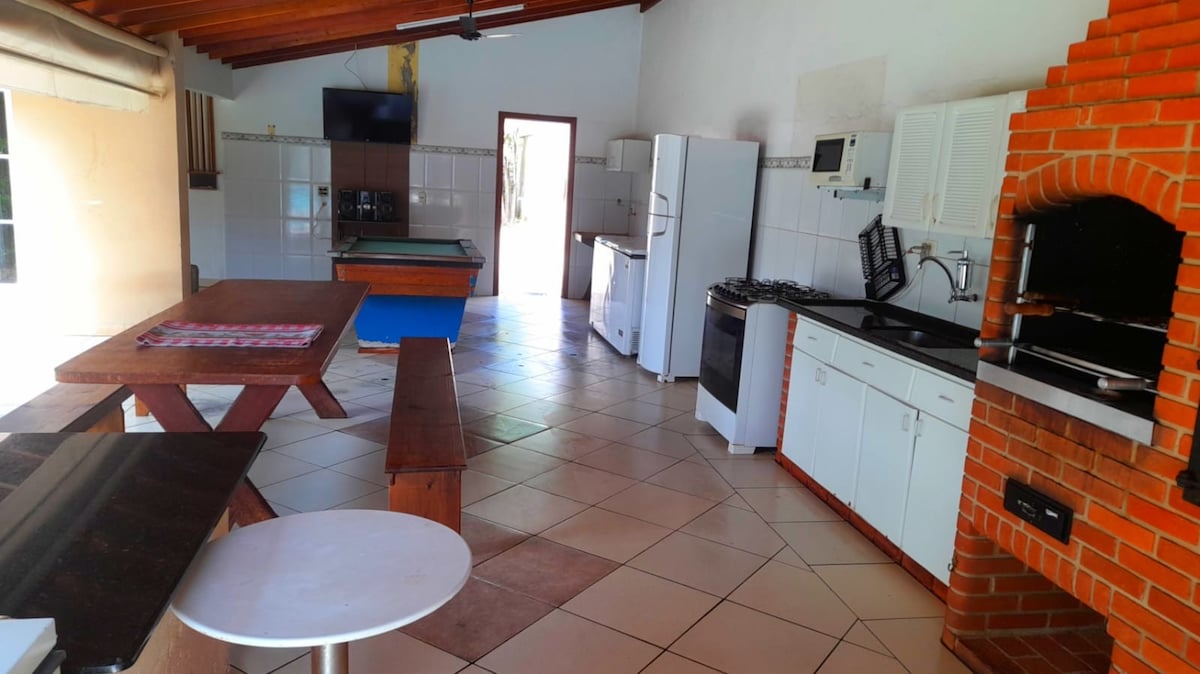 La casa dispone di un'ampia area gourmet con barbecue e forno elettrico con vista sulla piscina e un delizioso sole pomeridiano, oltre a un campo da calcio e pallavolo. Qui avrai accesso a uno spazio tranquillo e accogliente con la pace e la libertà che non troverai altrove!
