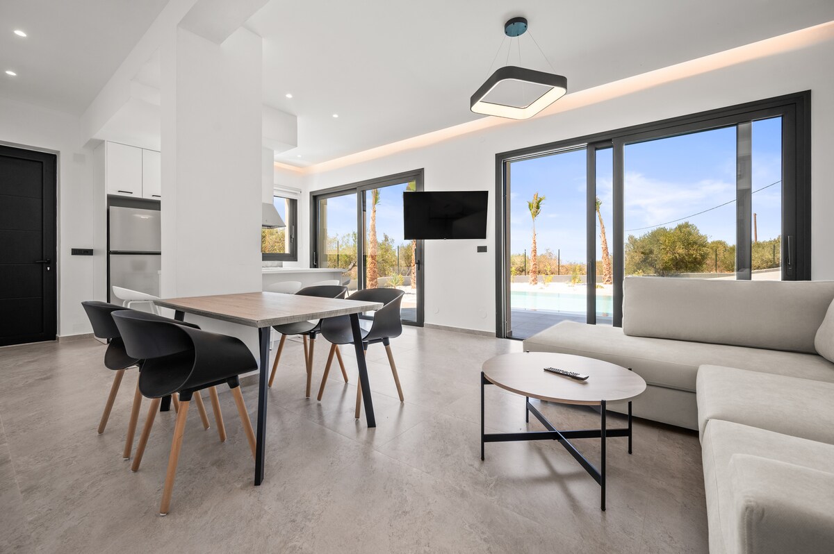 Vicino all'aeroporto di Candia si trova il tranquillo villaggio di Agriana, circondato da alberi di olivo. Ethera Villa I, una delle due ville, offre privacy con area recintata e cancello elettrico. Dispone di piscina privata, pergolato, barbecue, due spaziose camere da letto con bagno interno e un soggiorno con cucina completa. Il rigoglioso giardino con palme crea un'atmosfera tropicale. La villa è dotata di aria condizionata, riscaldamento e Smart TV LG. Le telecamere di sicurezza possono essere spente su richiesta. Goditi il soggiorno perfetto!