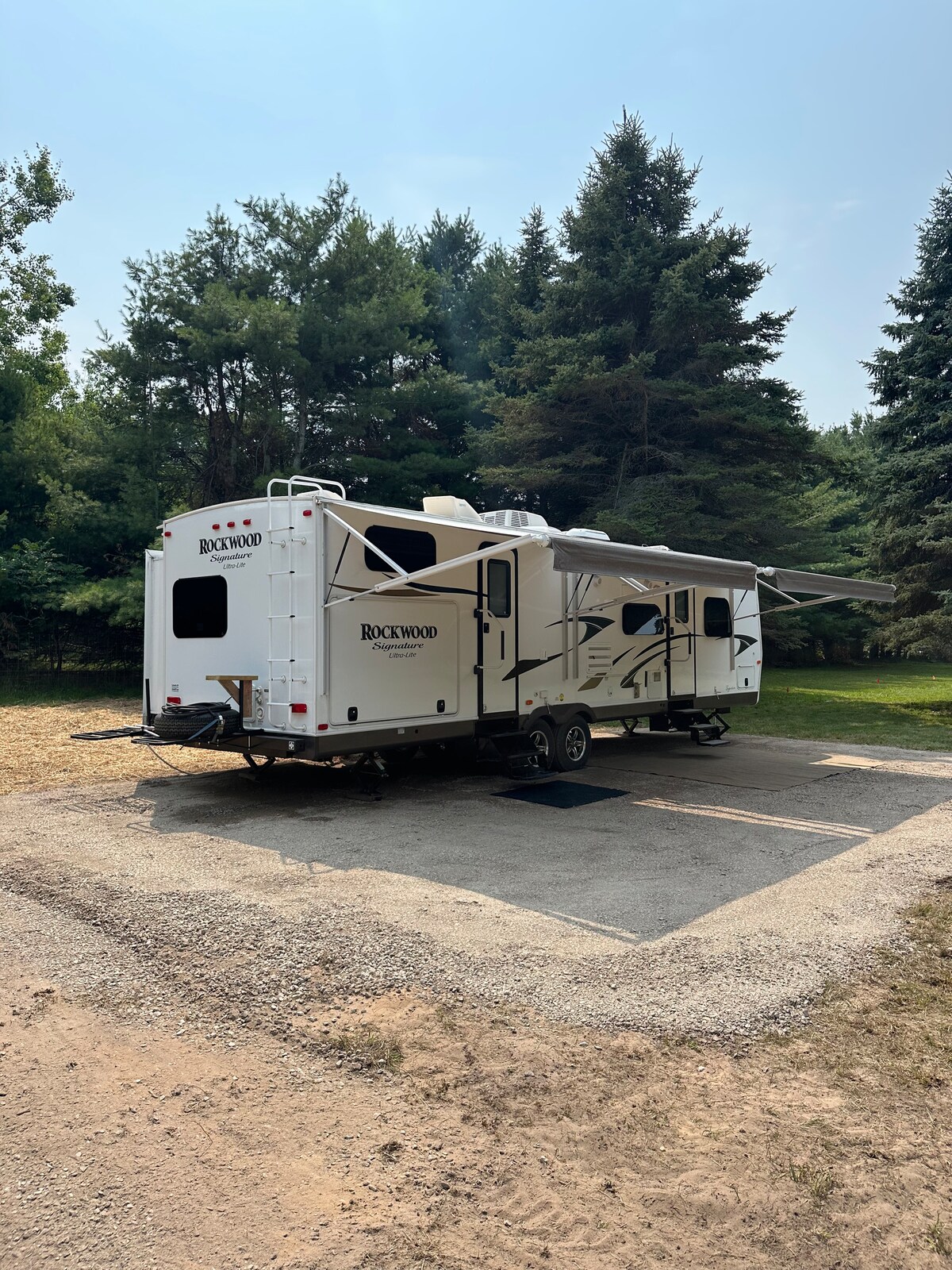 Enjoy privacy and seclusion on a large private lot with large pines. This very unique campsite offers our luxurious Rockwood Signature camper on a stone pad with full utility hook up and fire pit. The property is very close to Mullet Lake swimming access at Boy Scout Park and public boat launch less than one mile away. Plenty of space to park and space for large trucks with trailers or boats. The area is also fenced with a large gate to keep your pets and rascals rounded up.