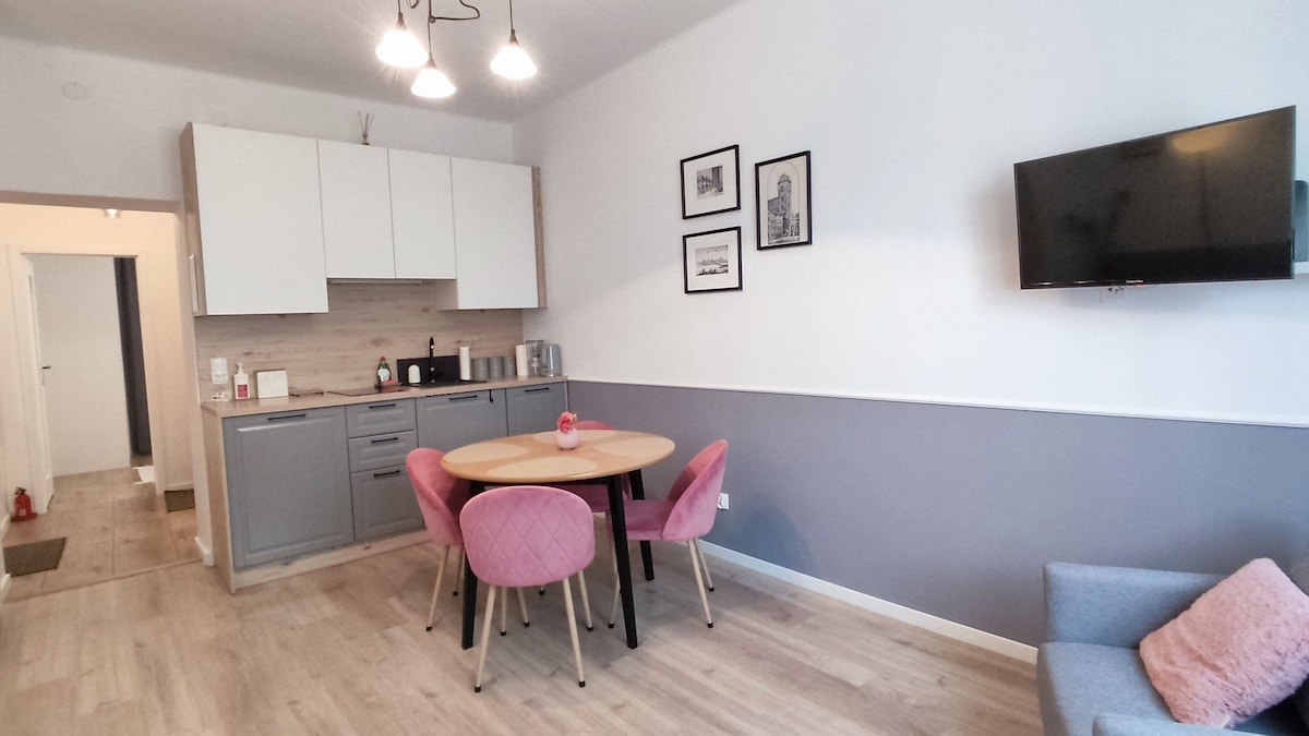 Benvenuti nel nostro appartamento unico, situato in una splendida casa in stile neorinascimentale francese, proprio accanto alla Cattedrale dei Santi Giovanni, nel cuore del centro storico di Toruń, patrimonio mondiale dell'UNESCO. L'appartamento offre 62 m² di spazio e un'atmosfera distintiva. È dotato di un ampio e luminoso soggiorno (36 m²) con divano letto pieghevole e zona notte con comodo letto. La cucina completamente attrezzata con zona pranzo (21 m²) include anche un secondo divano pieghevole.