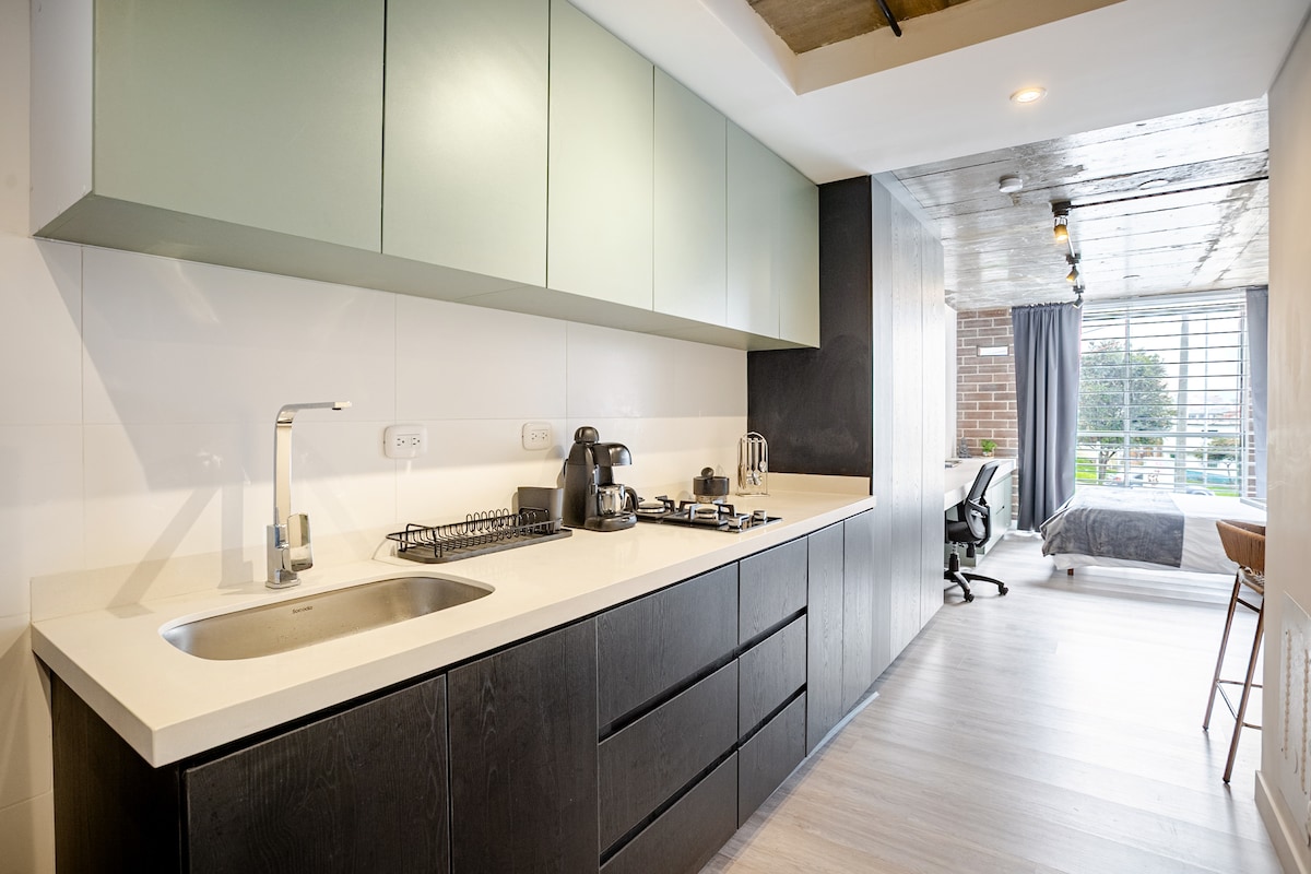 Espacio moderno, tranquilo y estratégico en el barrio Spring (norte de Bogotá). A 3 cuadras de TransMilenio Alcalá y cerca a la calle 134. Ideal para ejecutivos o estancias confortables. WiFi alta velocidad, chimenea a gas, lavadora, secadora y parqueadero cubierto. Edificio con ascensor y zonas comunes (terraza BBQ y salón). Cuenta con acogedor altillo tipo loft que hace la experiencia única (acceso por escaleras plegables) Más de 100 reseñas y calificación 4.9 garantizan calidad.