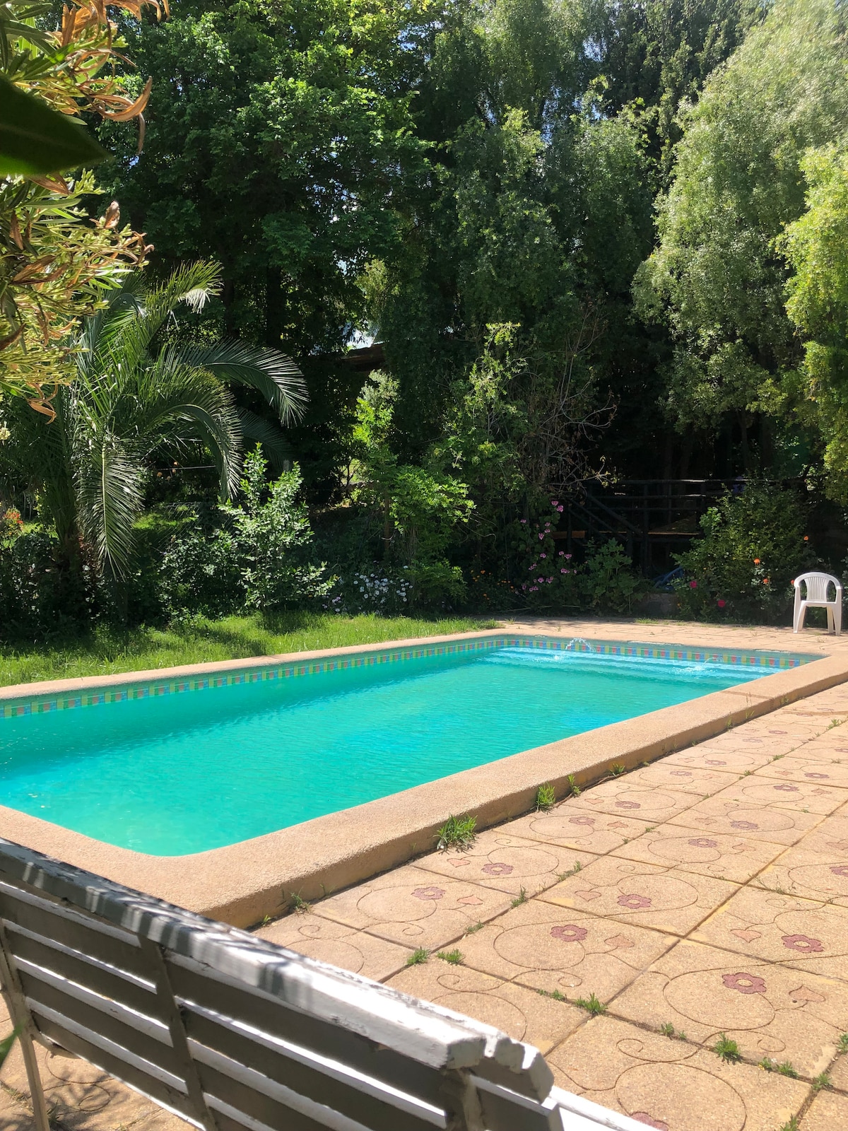 Bellissimo e ampio cottage situato nel comune di Mostazal a 50 minuti da Santiago tramite l'accesso sud o l'autostrada 5 sud e a 5 minuti dal casinò Monticello. Goditi 2000 metri quadrati di natura, ideale per trascorrere qualche giorno di riposo e contatto con la natura, lontano dalla città. Offriamo il nostro "rifugio", stile farfalla, con 2 camere da letto con letti matrimoniali, due bagni privati con tutti i comfort inclusi (asciugamani, articoli da toeletta e asciugacapelli).