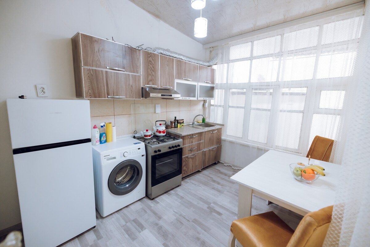 Enjoy a relaxing stay in this spacious two-bedroom house in the very heart of Ganja. The home features a huge living room, a separate fully equipped kitchen, and a small private yard perfect for outdoor dining. Step outside and you are directly at the central city square, surrounded by cafés, shops, and attractions. Free parking is available. Ideal for families, couples, or small groups.