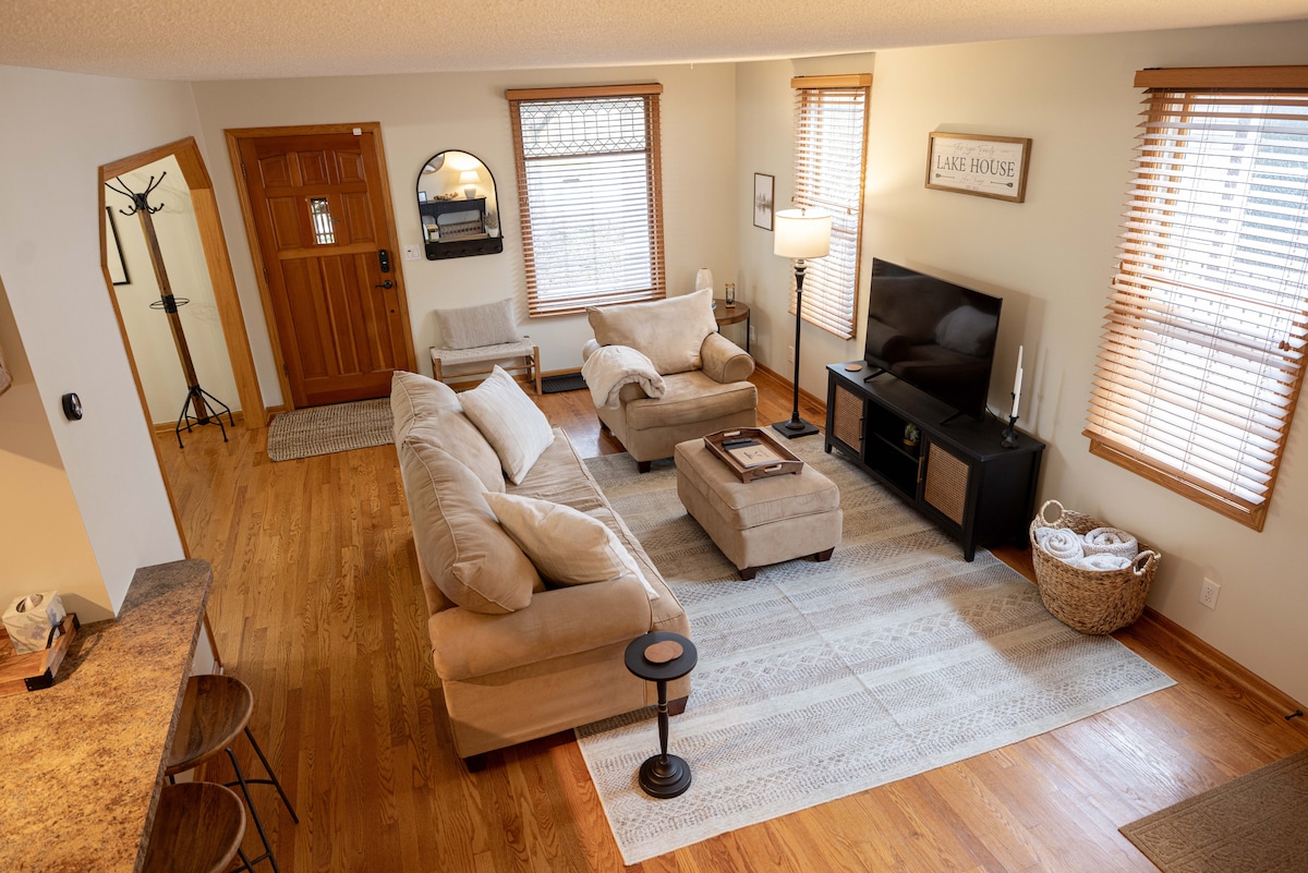 TUTTI sono i benvenuti in una casa privata sopra il pittoresco villaggio di Taylors Falls. Perfetto per soggiorni in famiglia, vacanze, gruppi e riunioni di amici per rilassarsi o lavorare. Wifi ad alta velocità, angolo cottura, ambiente naturale, focolare e parcheggio privato per 9 auto di dimensioni regolari. Seguiamo le linee guida avanzate per la pulizia per l'emergenza COVID-19, con luci UV e filtri HEPA su caldaie/condizionatori. Il numero totale di ospiti deve corrispondere a quello indicato nella prenotazione.