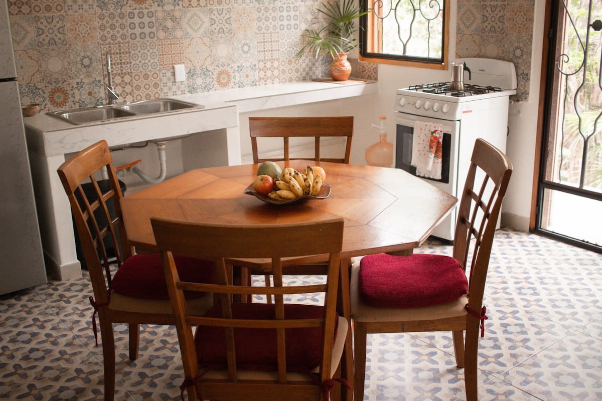 Casa Nómade è un rifugio boho-chic di 140 m ² a La Veleta, nascosto in una tranquilla comunità boutique recintata vicino alla vivace Calle 7. Rilassati nel tuo giardino privato nella giungla, una rinfrescante piscina con cascata d'acqua e un salotto integrato per pomeriggi ombreggiati. All'interno, le aree spaziose incontrano un design indigeno artigianale. Goditi un letto matrimoniale grande, i deliziosi prodotti da bagno Yucatán Senses e la connessione Wi-Fi ad alta velocità.