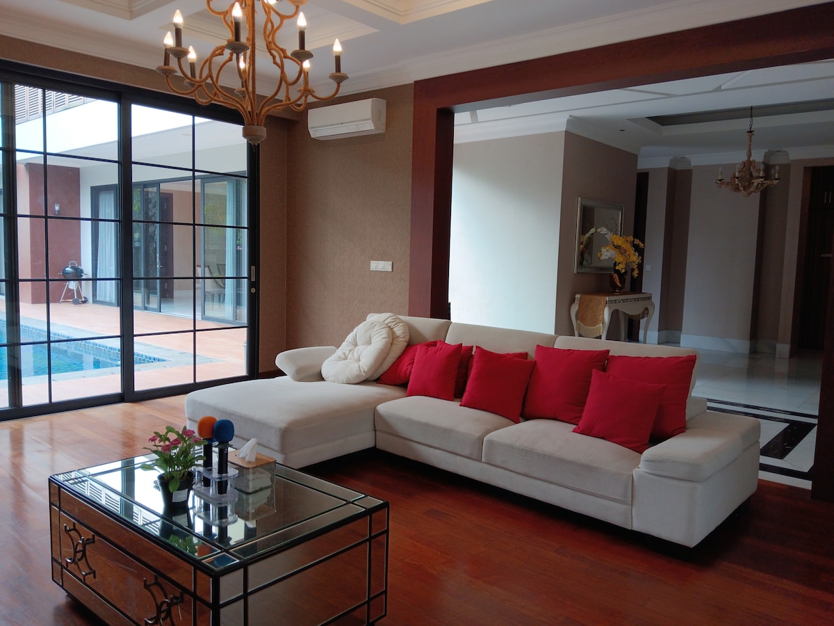 Rilassati con tutta la famiglia in questo alloggio tranquillo. Questa villa di nuova concezione, situata nel nuovo complesso all'interno di Vimala Hills, dispone di una propria club house privata dove potrai trascorrere del tempo con la tua famiglia per nuotare. Goditi la struttura all'interno di Vimala, come la fattoria/parco degli animali, gli accoglienti ristoranti nelle vicinanze e, naturalmente, un soggiorno confortevole nella nostra villa. La villa è dotata di cucina (fornello elettrico, frigorifero, cuociriso, friggitrice ad aria, forno a microonde) e utensili da cucina. Sono disponibili anche karaoke, Netflix e barbecue