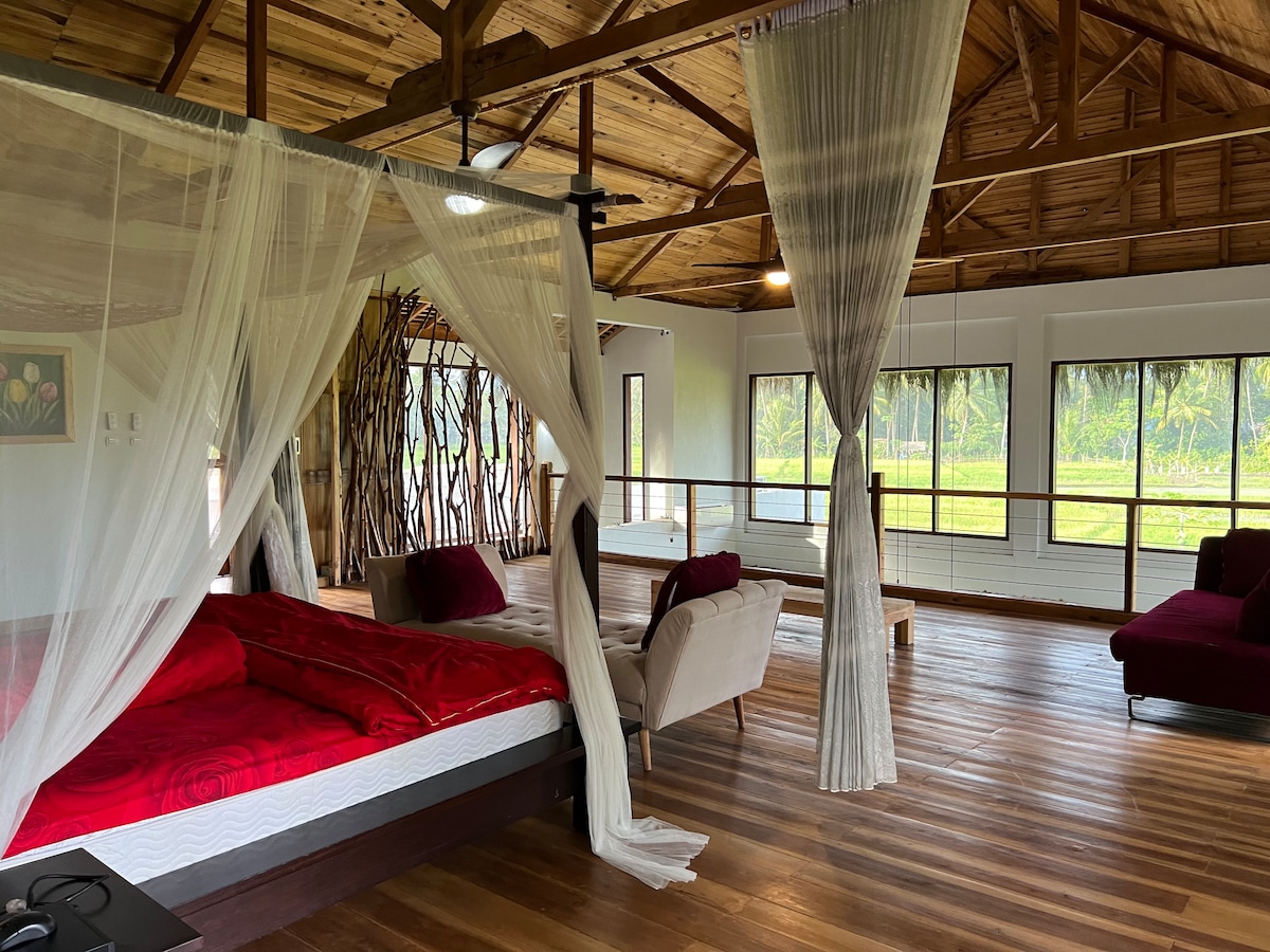 Il bungalow è costruito nel tradizionale stile giavanese, che mantiene gli interni freschi durante il giorno. Il tetto a tetto spiovente è realizzato da lavoratori locali provenienti da palme che crescono lungo le rive del fiume. Dalla terrazza del bungalow si gode di una splendida vista sul fiume Green Canyon. Esplora il fiume da solo con i nostri kayak. Il nostro alloggio si trova a pochi passi dal punto principale per fare surf di Batu Karas (1 km).