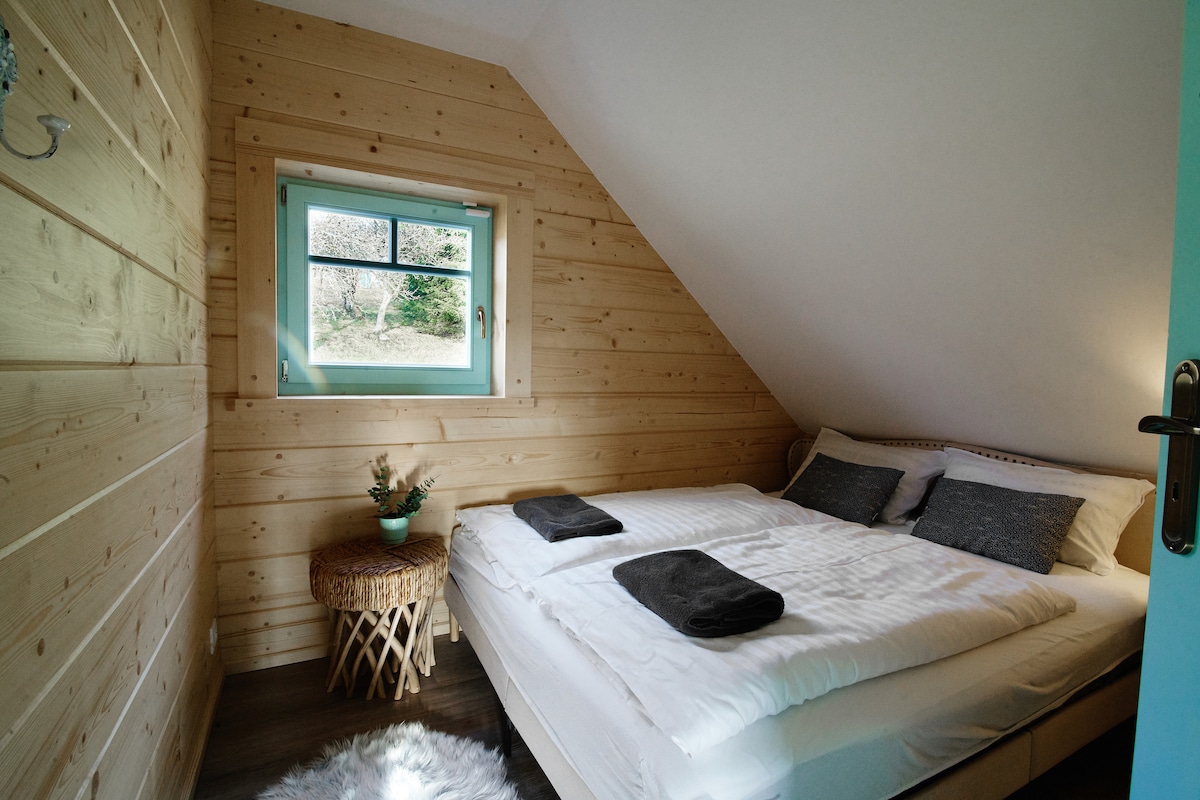 I cottage sono riscaldati tutto l'anno. Al piano terra c'è il riscaldamento a pavimento, mentre nelle camere da letto ci sono dei radiatori. Ogni cottage dispone di due camere da letto al piano superiore (matrimoniali e quadruple con armadio e comò), soggiorno con angolo cottura (completamente attrezzato) con area giochi per bambini, TV LED, WiFi, bagno con doccia e vestibolo. Dal soggiorno si accede ad un patio con mobili da esterno, lettini prendisole e barbecue. Asciugamani e lenzuola sono forniti agli ospiti con un cottage.
