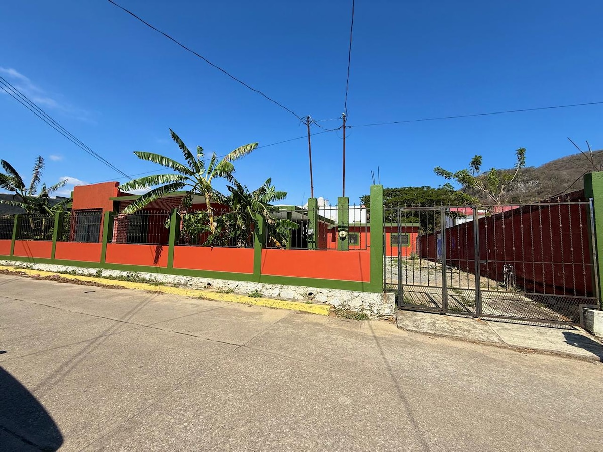 Goditi la nostra accogliente casa, il suo ampio cortile e la sua ottima posizione nel centro di Juchitan. In un ambiente tranquillo e adatto alle famiglie. Ideale per coppie e persone che amano la natura e l'architettura messicana. Dispone di un bagno privato in camera, soggiorno con televisore e scrivania, una piccola cucina con frigorifero e piano cottura e un bel corridoio tradizionale con vista sul cortile. Possono parcheggiare il loro veicolo all'interno della proprietà Condividi il patio con la nostra casa di famiglia.