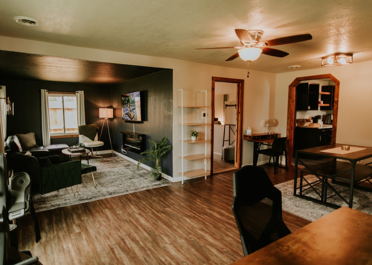 Questa bellissima suite si trova in una posizione privilegiata proprio nel centro della città, a pochi passi da bar, ristoranti, Cops and Doughnuts, negozi, binari per sentieri, parchi e cinema! Adatta per due persone ma abbastanza spaziosa per una piccola famiglia, la East Room dispone di un letto matrimoniale, un divano in pelle, un tavolino, una cucina e un bellissimo bagno. Guarda fuori dalla finestra panoramica per ammirare la Main Street di Clare. Siamo a 17 minuti dal casinò e dalla CMU.