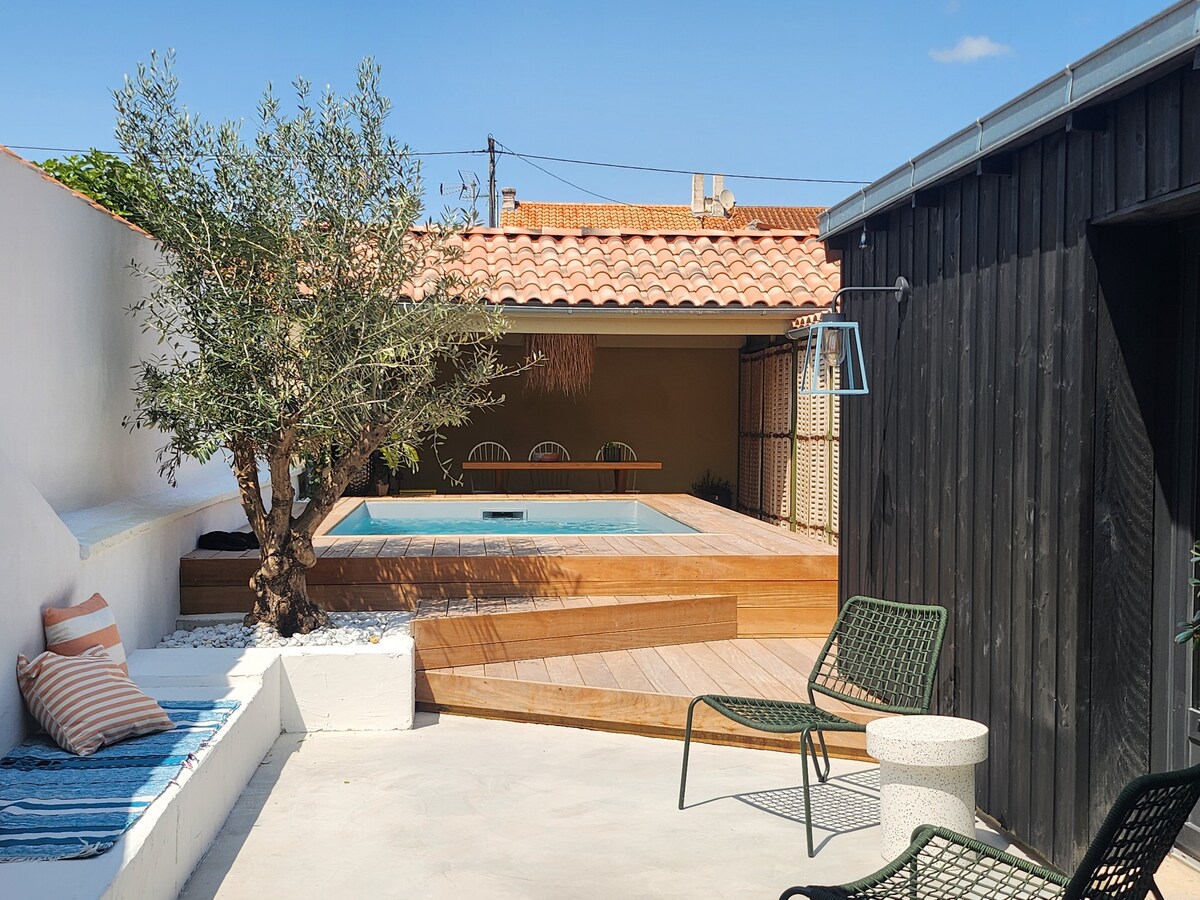 Casa di circa 60 mq composta da un soggiorno con divano letto, una cucina a vista attrezzata e arredata, una camera da letto con divano letto (rete a doghe), una cabina armadio, un bagno con cabina doccia e mobiletto. Un WC separato con una lavanderia . Un terreno alberato recintato e senza dirimpettai, una piscina privata, due terrazze. Ideale per una famiglia che ama la tranquillità e la natura. Vicino a tutti i negozi a piedi Vicino alle spiagge di Chatellailon