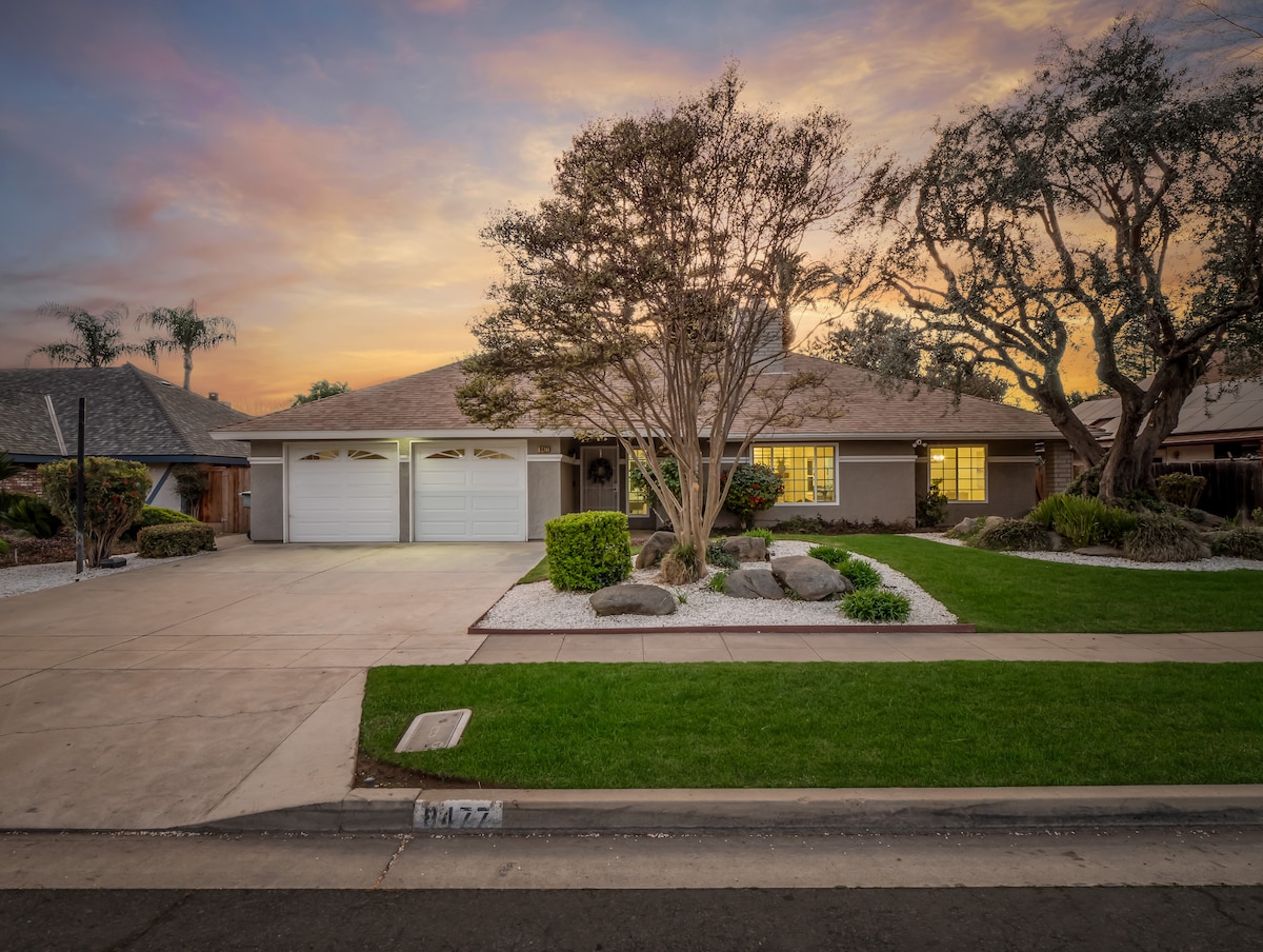 Fresno nord-orientale: quartiere tranquillo e sicuro Questa casa è perfetta per gruppi o famiglie fuori città. Può ospitare comodamente 10-12 persone. Vicino allo Yosemite (90 km di distanza). Casa privata di✔ 230 metri quadrati! Wifi ✔ veloce ✔ Garage, vialetto e parcheggio in strada Lavanderia ✔ interna con detersivo in dotazione ✔ 3 Smart TV Amazon da 65 pollici ✔5 camere da letto, 3 bagni completi Due spazi di lavoro dedicati. Cucina completamente attrezzata per cucinare. Ampio posto auto nel vialetto. Perfetto per soggiorni più lunghi. NON adatto a feste rumorose.