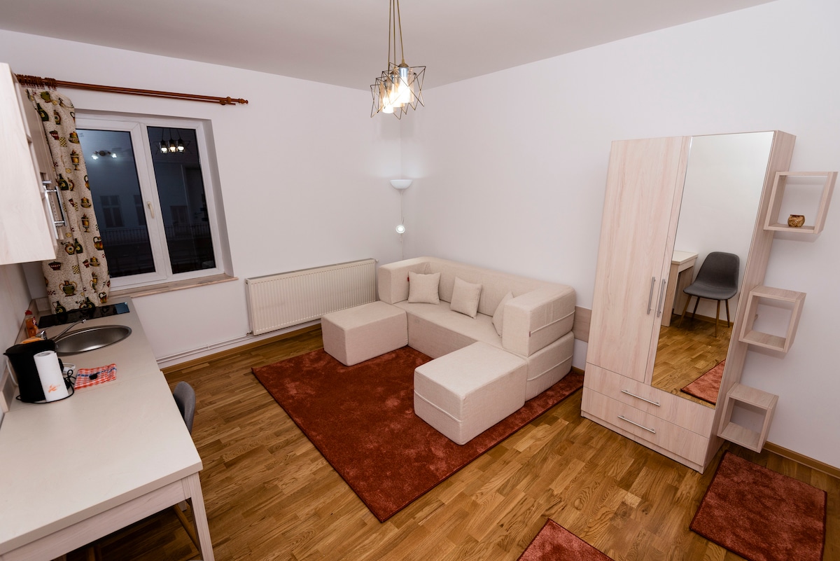 Located on a pedestrian side of the Unirii Sqare right in the heart of the historic center, with most attractions, restaurants and caffee’s at your doorstep. Private entrance, thoughtfully designed interior with personal touches, exposed brick walls and artworks reflecting the host’s style and personality. Large couch, queen size double bed with flat mattress, soft linens. Private bathroom with walk-in shower. Kitchenette with essential devices such as a microwave, a hot plate, and frige.