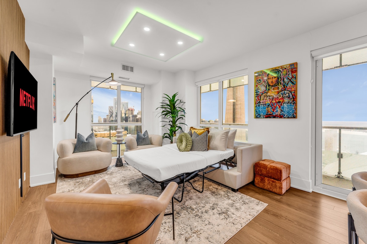 Questo appartamento con una camera da letto al 21° piano offre una vista mozzafiato sulla città, pavimenti rinnovati in tutto l'appartamento e un materasso Endy di alta qualità per un sonno riposante. Ideale per viaggiatori d'affari o coppie, la suite può ospitare fino a 4 persone con un letto king-size e un divano letto. Goditi un facile accesso ai migliori ristoranti, caffè, gallerie e principali attrazioni del centro città, tutti raggiungibili a piedi. Rilassati sul balcone privato con vista sullo skyline. Prenota il tuo soggiorno oggi stesso!