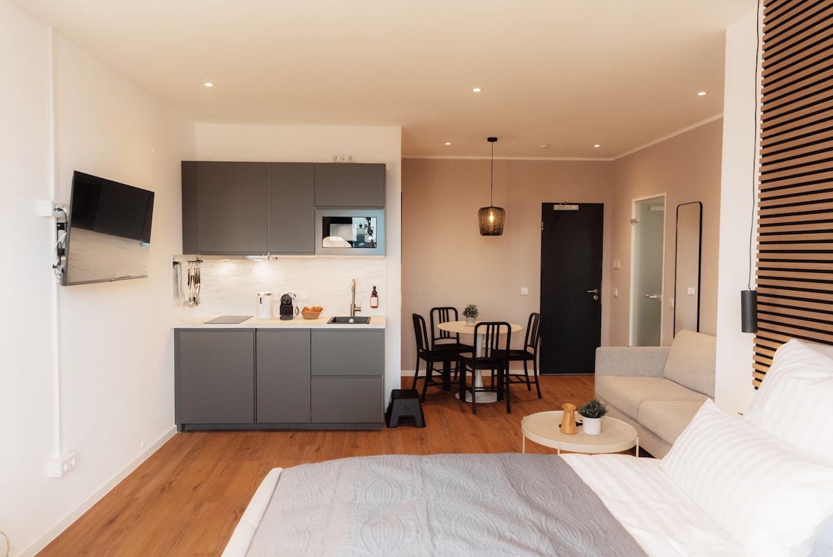 Soleggiato ed esclusivo monolocale nel centro di Colonia per 1-2 persone; open space, riscaldamento a pavimento, letto comodo (1,40 x 2 m), elegante zona giorno, cucina, mobili da incasso di alta qualità; bagno dal design moderno con luce naturale/arredi esclusivi; WiFi ad alta velocità fino a 100 mbit/sec; sofisticata illuminotecnica A 3 minuti dalle vie dello shopping, ristoranti e bar a portata di mano, a 800 metri dalla cattedrale, autostrada A57 raggiungibile in auto in 5 minuti. Prenotazioni di almeno 90 giorni su richiesta.