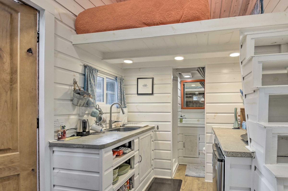 "Snuggle Inn" è l'accogliente monolocale vintage che stavi aspettando. Arredato in modo professionale, questo chalet con 1 bagno ti farà sentire come se fossi negli anni '40, ma non senza comfort moderni. Nell'angolo cottura troverai una macchina per il caffè, un mini-frigo e tutti i piatti e gli utensili necessari per preparare pasti semplici. Esci e goditi la vasca idromassaggio e il focolare a legna. La sera, rilassati sull'amaca con un buon libro o accoccolati davanti alla Smart TV per una serata di cinema.