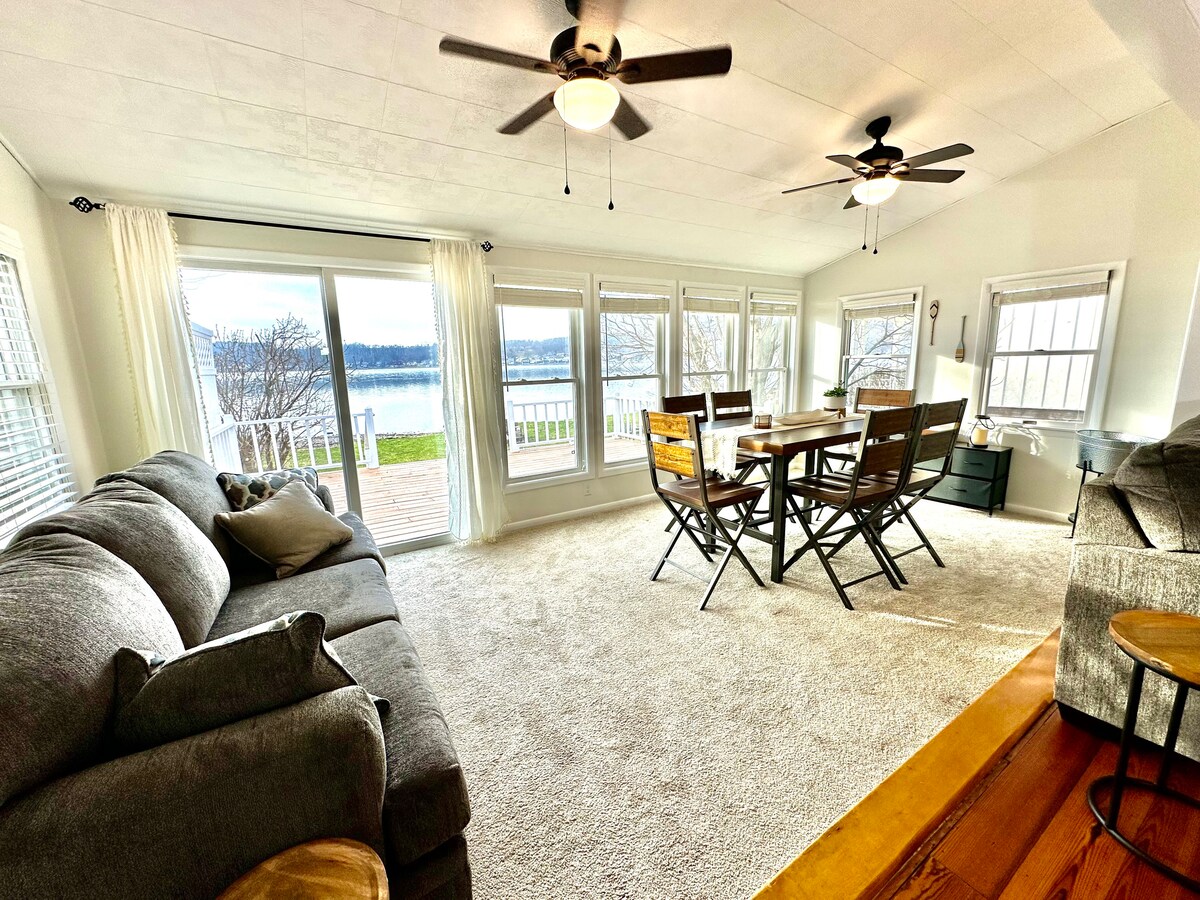 Posizione perfetta per ammirare la bellezza del lago Conesus! La nostra casa a tre piani, situata in posizione centrale, è impreziosita da due terrazze sul lago (una fuori dalla camera da letto principale e una fuori dalla zona giorno/pranzo). Goditi il caffè (o il vino) mentre ammiri il lago scintillante. Vuoi rilassarti in riva al lago? Abbiamo una terrazza sul lago e un molo privato a tua disposizione! Non hai una tua imbarcazione? Noleggiane una in zona! La pianta aperta e l'ampio tavolo da pranzo rendono questo alloggio perfetto per grandi riunioni di famiglia o con gli amici.