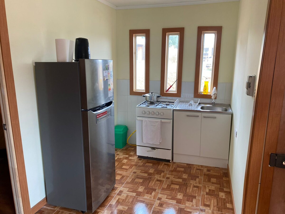 Mini cabaña en barrio residencial y tranquilo en Constitución. Ambiente familiar ideal para descanso, cercano terminal de buses y ferrocarriles, hospital y supermercados. A 10 minutos en auto de las principales playas de la ciudad y a pasos del río Maule. Adicionalmente contamos con lavandería, quincho y piscina compartidos (consulte disponibilidad). Importante, al momento de reservar indicar la cantidad de personas total para disposición de 1 o 2 camas. (Cama matrimonial + cama individual)