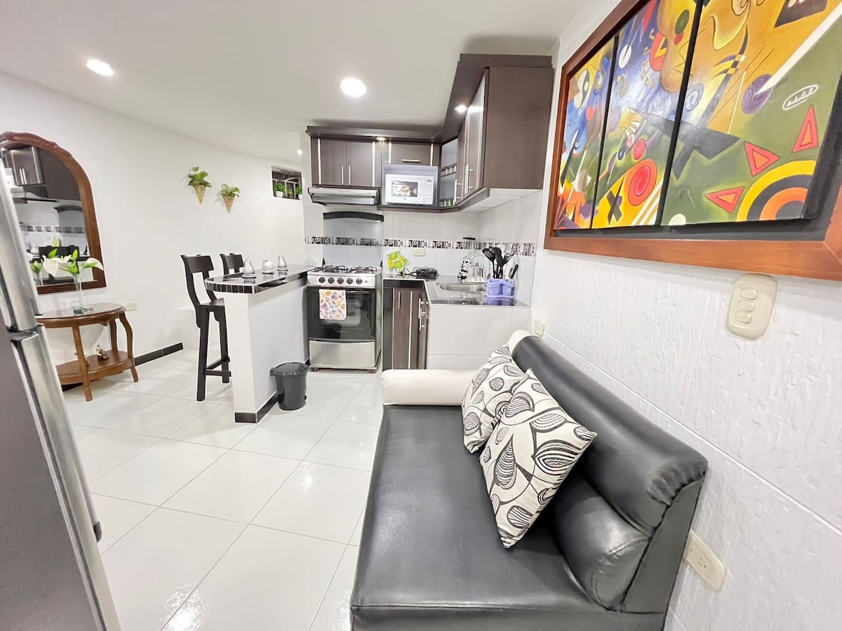 Disfruta de tu estadía en nuestro aparta estudio completamente amoblado, cuenta con cocina integral, nevera, dos sillas para bar, lavadora, tendedero, cama doble, sofá cama, colchón inflable, 2 TV pantalla plana, aire acondicionado, ventilador, ducha, servicios de agua, gas, energía y wifi incluidos, incluye toallas y sábanas limpias, jabón - shampoo, papel higiénico, Movistar TV. El espacio se puede adecuar con sofá cama y colchones inflables para 2 o 3 personas más.