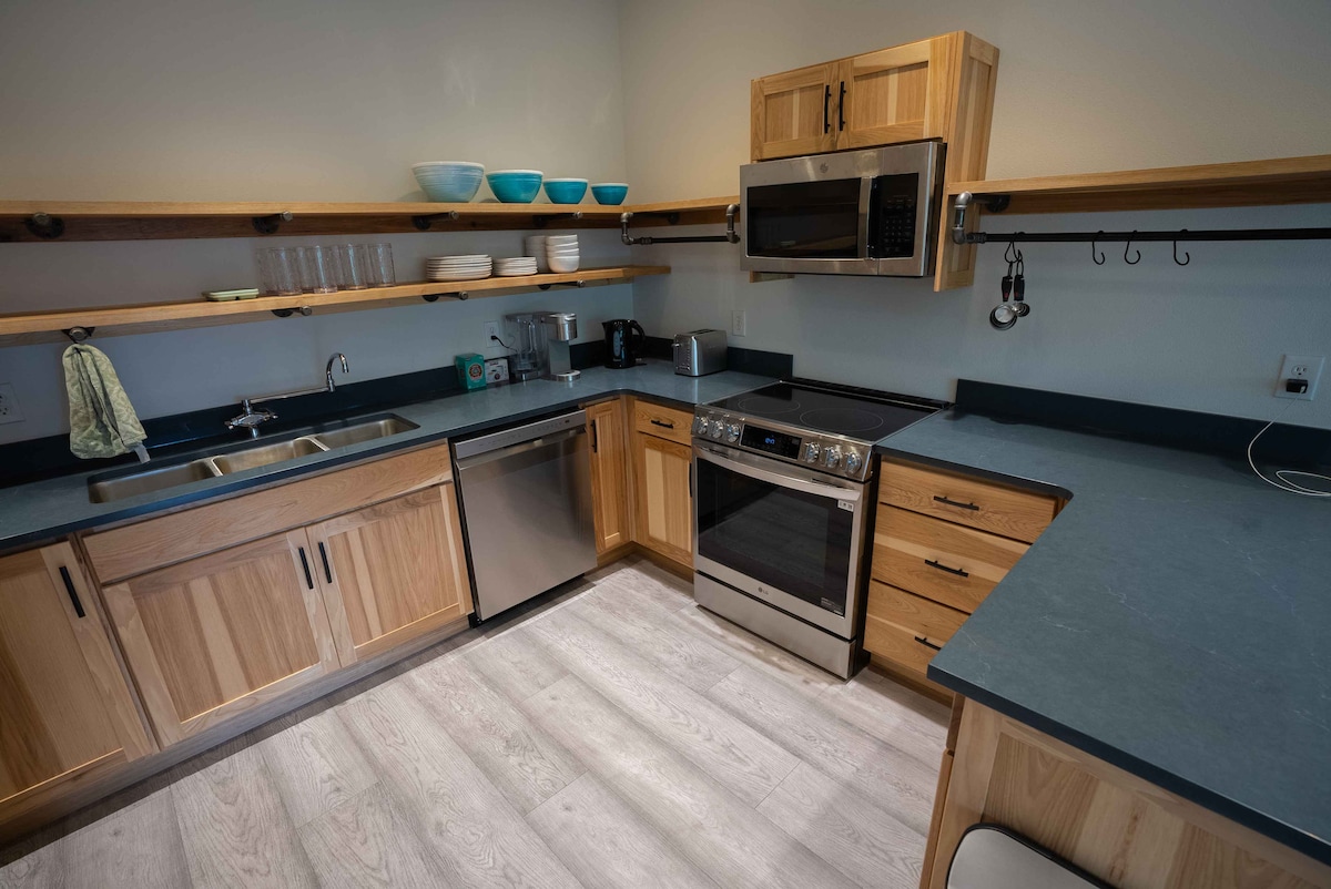 Questa incredibile casa in legno presenta una lussuosa camera da letto matrimoniale con un letto matrimoniale grande e un bagno privato nel soppalco. La zona al piano inferiore include tre letti matrimoniali e un comodo bagno di servizio con lavatrice e asciugatrice. Il piano principale vanta una cucina completamente attrezzata, un bagno e un accogliente soggiorno. I sei sgabelli del bar intorno al bar della cucina e il tavolo da pranzo per sei persone offrono ampio spazio per intrattenere fino a dodici ospiti.
