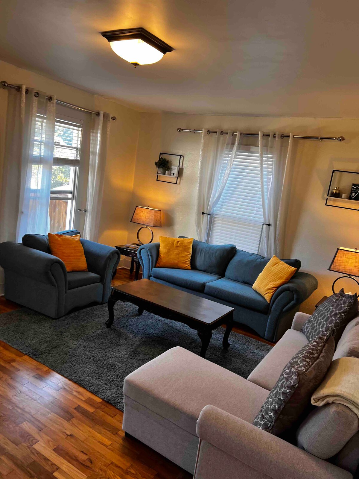 This fully furnished ground-level guest suite with expansive views is designed for comfort and ease, whether for short or extended stays. At 800 square feet, it features a clean, open-concept layout, thoughtful furnishings, and in-suite laundry facilities, which make settling in effortless. Two oversized sliding glass doors open to a deck with outdoor seating and Bay views that guests rave about. The living area features cozy seating, a smart TV on wheels for flexibility, and a workspace setup.